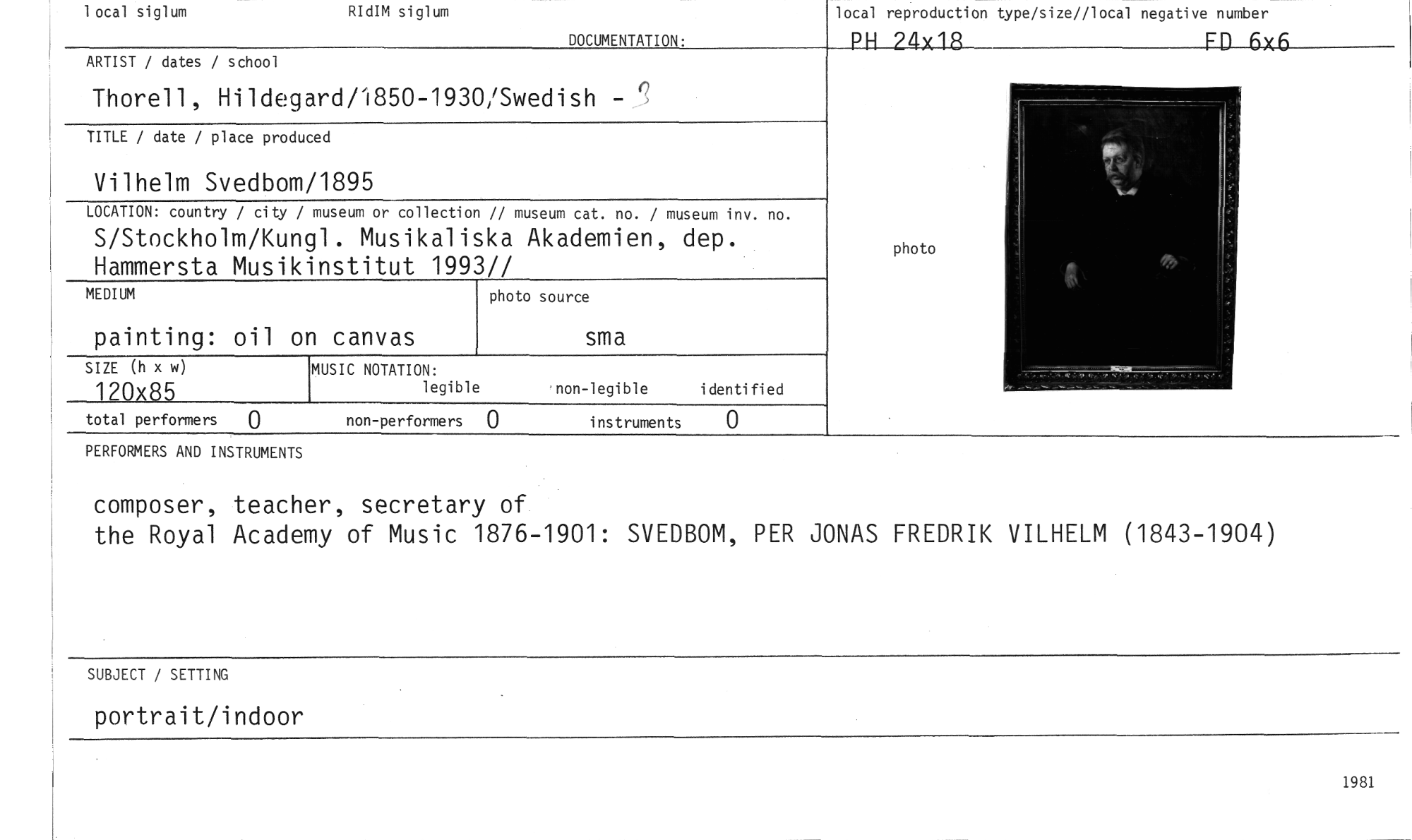 //// 1 ocal siglum RIdIM siglum //// DOCUMENTATION: //// lotal reproducti on type/si ze//1 ocal negative number //// P4_24418__ FD 6x6 //// ARTIST / dates / school //// Thorell, Hildegard/1850-1930/Swedish - //// TITLE / date / place produced //// Vilhelm Svedbom/1895 //// LOCATION: country / city / museum or collection // museum cat. no. / museum inv. no. //// S/Stockholm/Kungl. Musikaliska Akademien, dep. Hammersta Musikinstitut 1993// //// MEDIUM //// sma //// SIZE (h x w) //// 120x85 //// painting: oil on canvas //// MUSIC NOTATION: //// 1 egi ble non-legible i denti fi ed //// photo source //// photo //// total performers 0 non-performers 0 instruments 0 //// PERFORMERS AND INSTRUMENTS //// composer, teacher, secretary of //// the Royal Academy of Music 1876-1901: SVEDBOM, PER JONAS FREDRIK VILHELM (1843-1904) //// SUBJECT / SETTING //// portrait/indoor //// 1981 ////