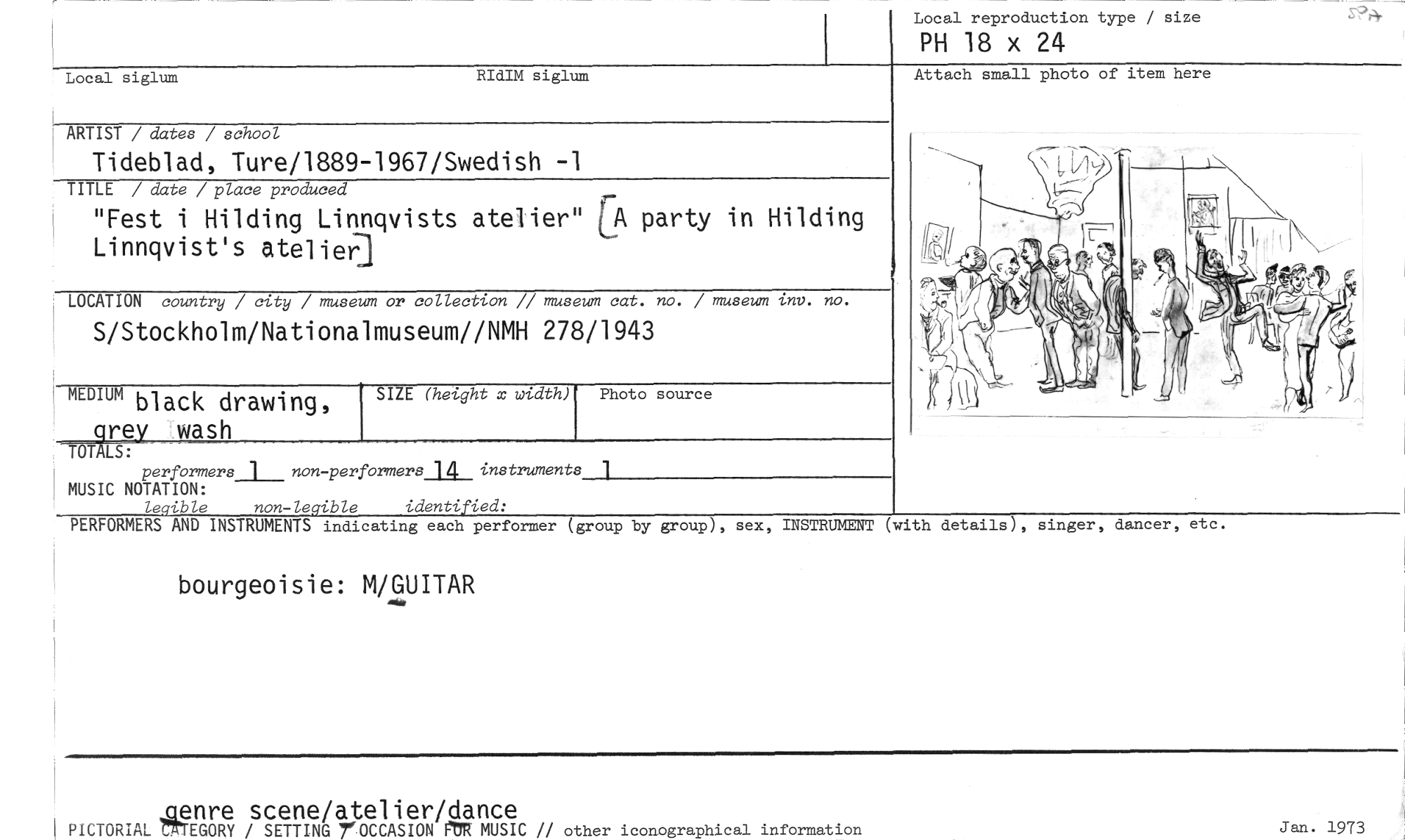 //// Local reproduction type / size //// PH 18 x 24 //// Local siglum RIdIM siglum //// Attach small photo of item here //// ARTIST / dates / school //// Tideblad, Ture/1889-1967/Swedish -1 //// TITLE / date / place produced //// "Fest i Hilding Linnqvists atelier" LA party in Hilding Linnqvist's atelie;^] //// LOCATION country / city / museum or collection // museum cat. no. / museum inv. no. //// S/Stockholm/Nationalmuseum//NMH 278/1943 MEDIUM black drawing, //// grey wash //// TOTALS: //// performers 1 non -performers_14__instruments 1 //// MUSIC NOTATION: //// leqible non-legible identified: //// PERFORMERS AND INSTRUMENTS indicating each performer (group by group), sex, INSTRUMENT //// (with details), singer, dancer, etc. //// SIZE (height x width) Photo source //// bourgeoisie: M/GUITAR //// genre scene/atelier/dance //// PICTORIAL CXTEGORY / SETTING 7'.00CASION pr MUSIC 7/ other iconographical information //// Jan. 1973 ////