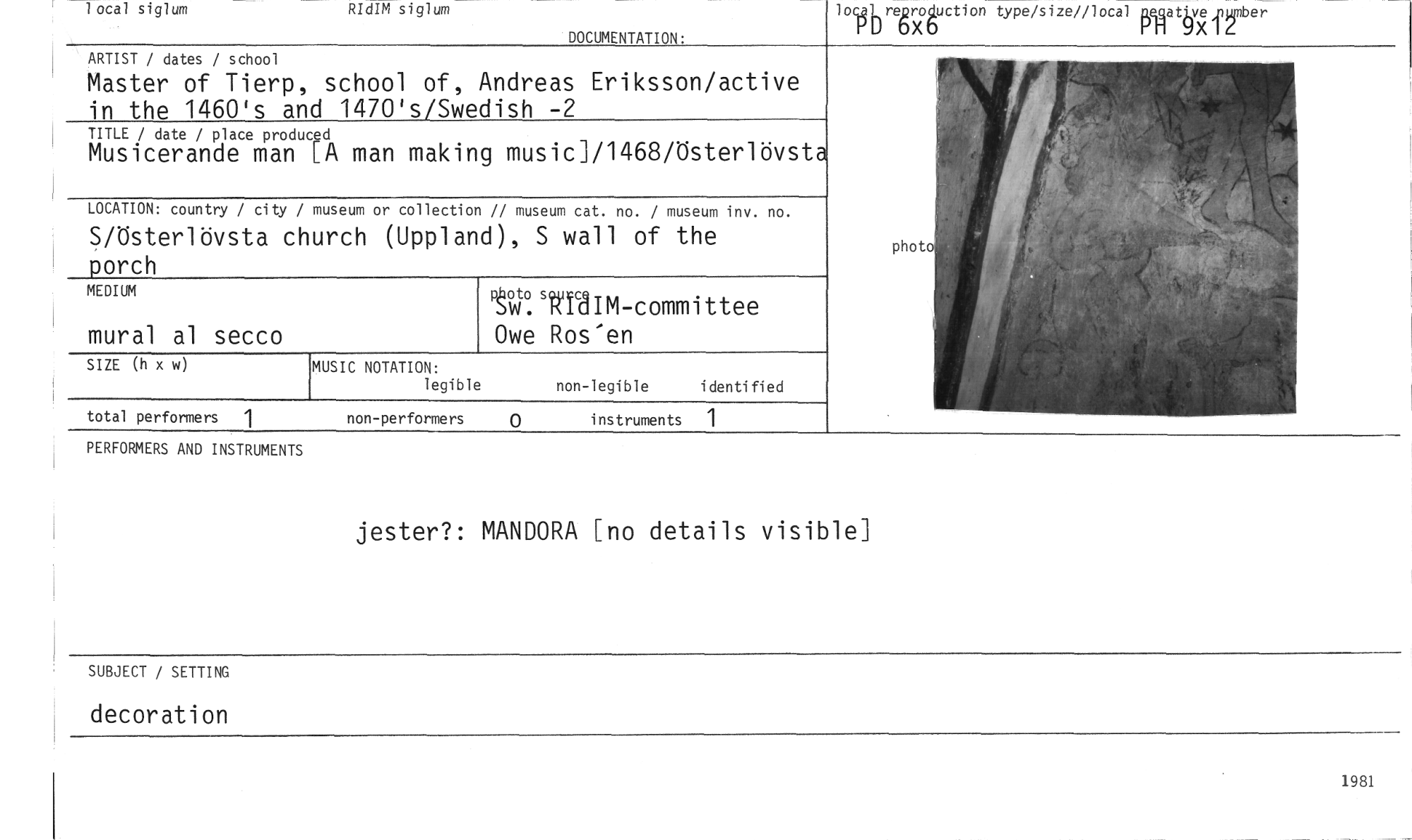 //// DOCUMENTATION: //// 1 oro], reproXpluction type/s i ze//local issqatisve kkrber PI 0 M 9X I //// I ocal siglum RIdIM siglum //// ARTIST / dates / school //// Master of Tierp, school of, Andreas Eriksson/active //// in the 1460's and 1470's/Swedish -2 //// TITLE / date / place produced //// Musicerande man [A man making music]/1468/Österlövsta //// LOCATION: country / city / museum or collection // museum cat. no. / museum inv. no. //// S/Österlövsta church (Uppland), S wall of the porch //// MEDIUM //// mural al secco //// SIZE (h x w) //// MUSIC NOTATION: //// legible non-legible identified //// ItWrffäIM-committee Owe Ros'en //// total performers 1 non-performers 0 instruments 1 //// PERFORMERS AND INSTRUMENTS //// jester?: MANDORA [no details visible] //// SUBJECT / SETTING //// decoration //// 1981 ////