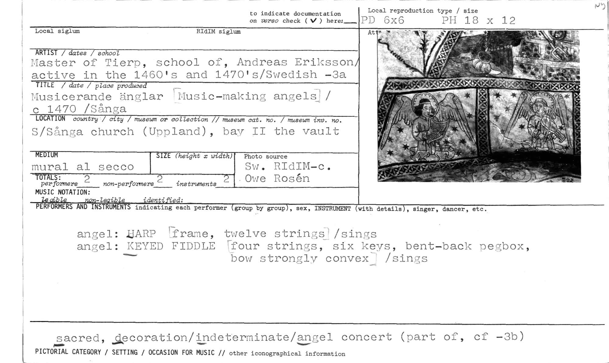 //// to indicate documentation //// on verso check ( ) here:- //// Local reproduction type / size //// PD 6x6 PH 18 x 12 //// Local siglum RIdIM siglum //// ARTIST / dates / school //// Master of Tierp, school of, Andreas Eriksson/ active in the 1460's and 1470's/Swedish -3a //// TITLE / date / place produced //// Musicerande änglar Music-making angel-Si/ c 1470 /Sånga //// LOCATION country./ city / museum or collection // museum cat. no. / museum inv. no. //// S/Sånga church (Uppland), bay II the vault //// MEDIUM SIZE (height x width) Photo source //// mural al secco Sw. RIdIM-c. //// TOTALS: 2 2 Owe Rosen //// per formers non-performers instruments //// MUSIC NOTATION: //// At //// lecrible non-leaible identified: //// PERFORMERS AND INSTRUMENTS indicating each performer (group by group), sex, INSTRUMENT (with details), singer, dancer, etc. //// angel: 1JARP game, twelve stringsl/sings //// angel: KEYED FIDDLE fsour strings, six keys, bent-back pegbox, bow strongly convexJ /sings //// sacred, .lecoration/indeterminate/angel concert (part of, cf -3b) //// P.. //// PICTORIAL CATEGORY / SETTING / OCCASION FOR MUSIC // other iconographical information ////