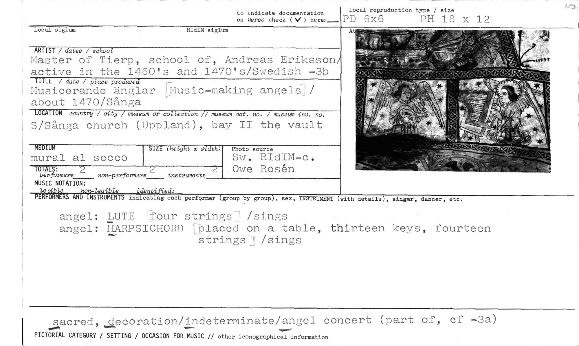 //// to indicate documentation //// on verso check (V ) here:_ //// Local reproduction type / size //// PD 6x6 PH 18 x 12 //// Local siglum RIdIM siglum //// ARTIST / dater / school //// Master of Tierp, school of, Andreas Eriksson/ active in the 1460's and 1470's/Swedish -3b //// TITLE / date / place produced //// Musicerande änglar 1Music-making angelsj about 1470/Sånga //// LOCATION country / city / museum or collection // museum cat. no. / museum 2ns. no. //// S/Sånga church (Uppland), bay II the vault //// MEDIUM SIZE (height x width) Photo source //// mural al secco Sw. RIdIM-c. //// Owe Rosén //// -MALS: 2 2 //// per formers non-perförmers instruments //// MUSIC NOTATION: //// leolible non-leaible identified: //// PERFORMERS AND INSTRUMENTS indicating each performer (group by group), sex, INSTRUMENT (with details), singer, daner, etc. //// angel: LUTE f:four strings I /sings //// angel: HARPSICHORD Uplaced on a table, thirteen keys, fourteen stringsI /sings //// sacred, decoration/indeterminate/angel concert (part of, cf -3a) //// PICTORIAL CATEGORY / SETTING / OCCASION FOR MUSIC // other iconographical information ////