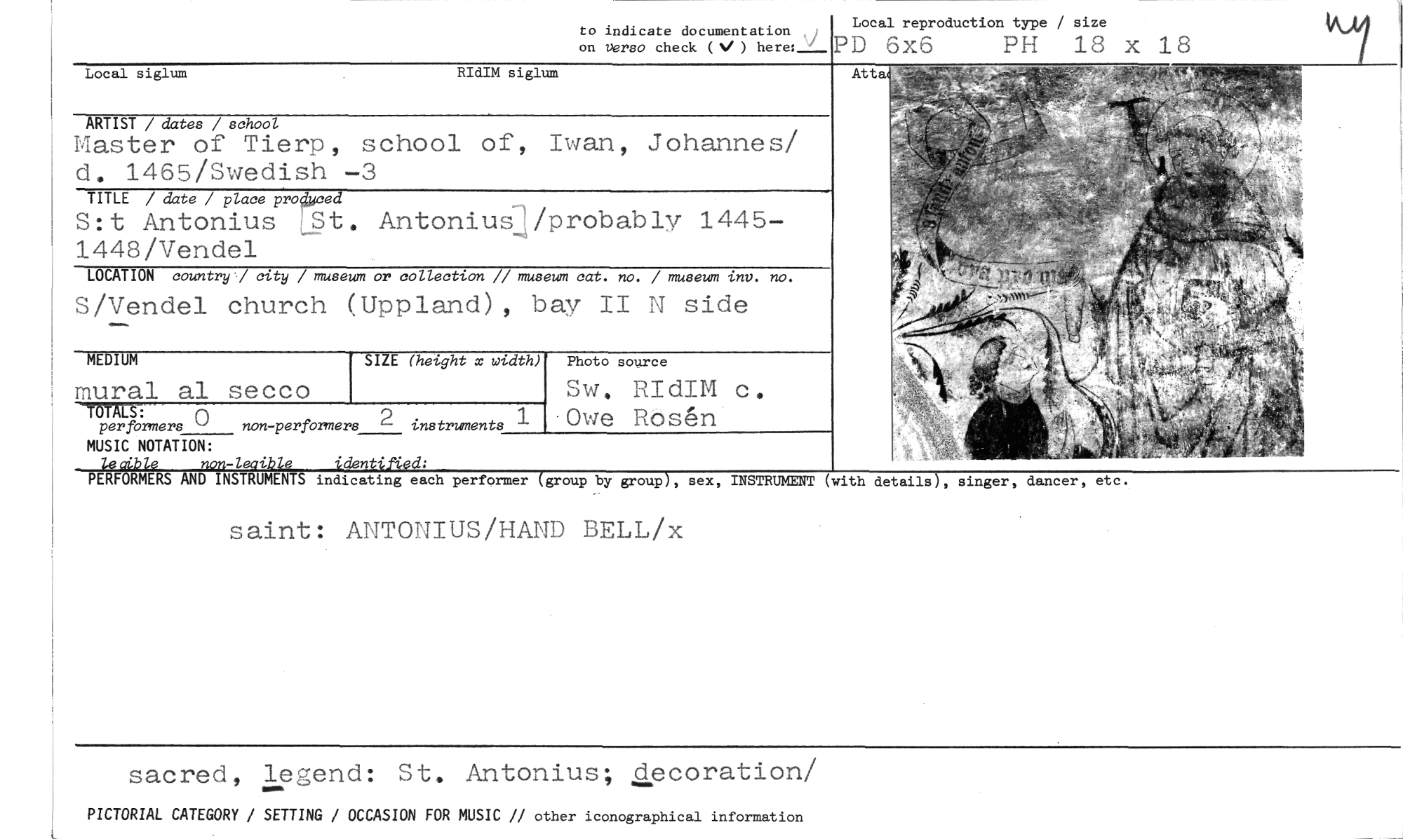 //// Local reproduction type / size //// PD 6x6 PH 18 x 18 //// Atta //// to indicate documentation , on verso check (V ) //// Local siglum RIdIM siglum //// ARTIST / dates / school //// Master of Tierp, school of, Iwan, Johannes/ d. 1465/Swedish -3 //// TITLE / date / place pro ed //// S:t Antonius LSt. Antonius]/probably 14451448/Vendel //// LOCATION country./ city / museum or collection // museum cat. no. / museum inv. no. //// S/Vendel church (Uppland), bay II N side //// MEDIUM ' SIZE (height x width) Photo source //// mural al secco //// Sw. RIdIM c. //// per formers 0 non-performers 2 instruments Owe Rösen //// MUSIC NOTATION: //// lecible non-leaible identified; //// PERFORMERS AND INSTRUMENTS indicating each performer (group by group), sex, INSTRUMENT (with details), singer, dancer, etc. //// saint: ANTONIUS/HAND BELL/x //// sacred, legend: St. Antonius; decoration/ //// PICTORIAL CATEGORY / SETTING / OCCASION FOR MUSIC // other iconographical information ////