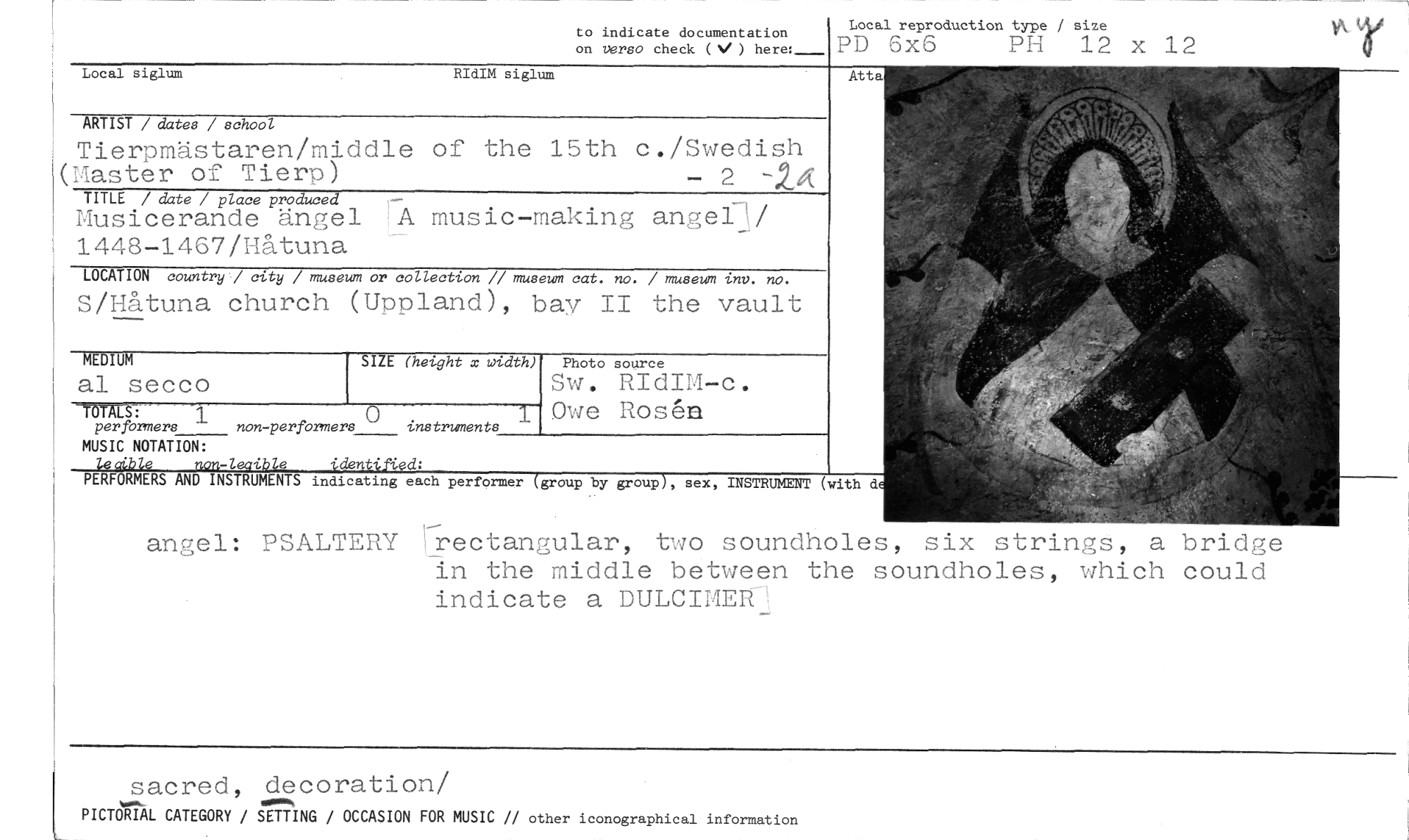 //// Local siglum //// RIdIM siglum //// SIZE (height x width) //// MEDIUM //// al secco //// angel: PSALTERY //// \rectangular, two soundholes, six stringS, a bridge in the middle between the soundholes, which could indicate a DULCIMER //// to indicate documentation //// on verso check ( ) here: //// Local reproduction type i size //// PD 6x6 PH 12 x 12 //// ARTIST / dates / school //// Tierpmästaren/middle //// (Master of Tierp) //// TITLE / date / place produced //// Musicerande ängel 1448-1467/Håtuna //// of the 15th c./Swedish //// - 2 -2,A //// music-making angel/ //// LOCATION countryj city / museum or collection // museum cat. no. / museum tnv. no. //// S/Håtuna church (Uppland), baj II the vault //// -TTA13: 1 C) //// per formers non-perfbrmers instruments //// MUSIC NOTATION: //// Photo source //// Sw. RIdIM-c. Owe Rosén //// performer group by group sex, INSTRUMENT (with d //// sacred, decoration/ //// or" //// PICTORIAL CATEGORY / SETTING / OCCASION FOR MUSIC // other iconographical information //// PE ////