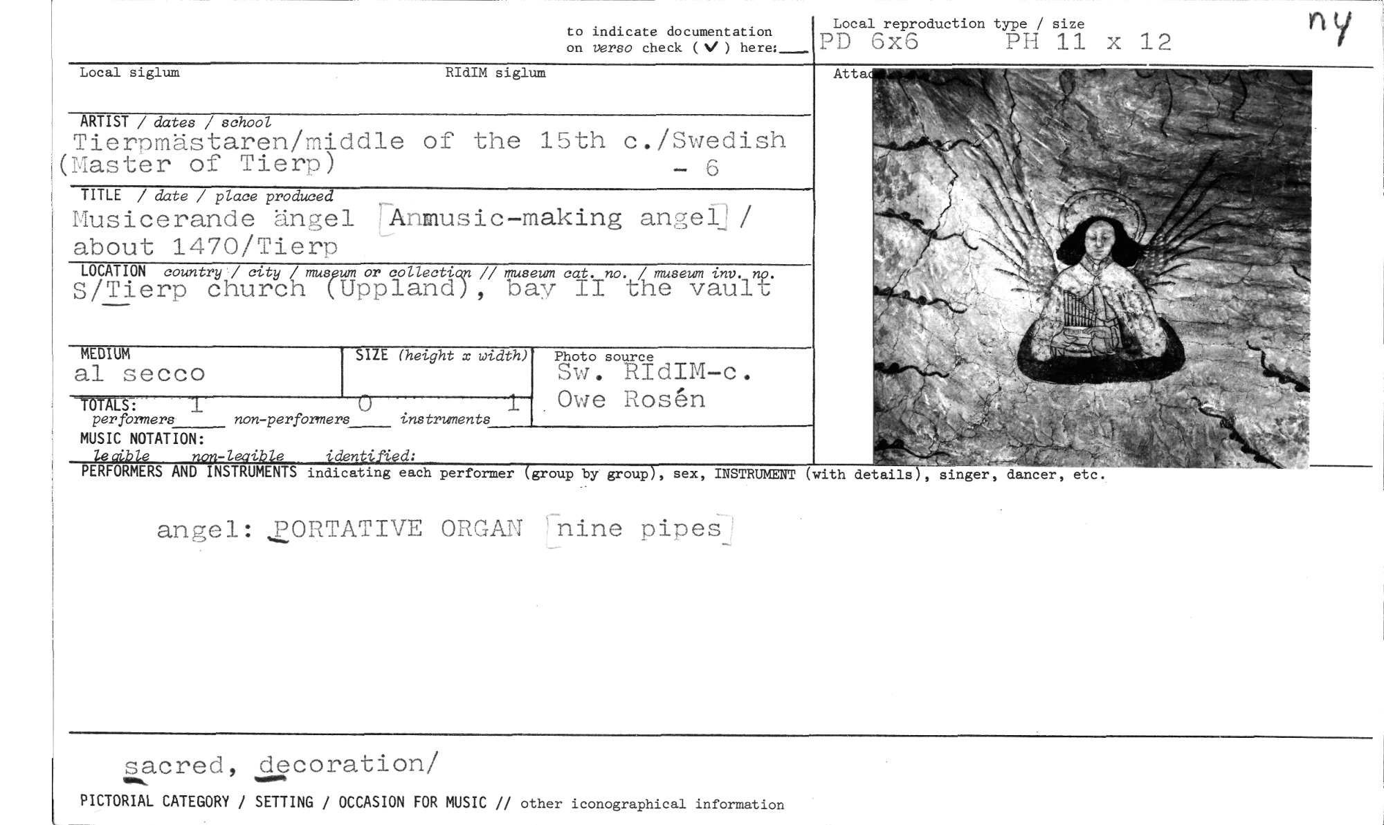 //// n I/ //// to indicate documentation //// on verso check (V ) here:___, //// Local reproduction type / size //// PD 6x6 PH 11 x 12 //// Local siglum RIdIM siglum //// ARTIST / dates / school //// Tierpmästaren/middle of the 15th c./Swedish (Master of Tierp) - 6 //// TITLE / date / place produced //// Musicerande ängel rAnmusic-making angelj/ about 1470/Tierp L---‹ //// LOCATION country'/ city / musoum or collecti // museum cat. no. / museum inv. no. //// S/Tierp church (Uppland)on , bay II the vaul //// //// MEDIUM SIZE (height x width) //// al secco //// 73Trr:---1 0 1 //// per formers non -performers instruments //// MUSIC NOTATION: //// -/ • 'de d: //// Photo source //// Sw. RIdIM-c. Owe Rosén //// PE RME' AND INSTRUMENTS //// indicating each performer group by group , sex, INSTRUMENT (with deta ls , singer, dancer, etc. //// angel: PORTATIVE ORGAN mine pipes! //// sacred, decoration! //// PICTORIAL CATEGORY / SETTING / OCCASION FOR MUSIC // other iconographical information ////