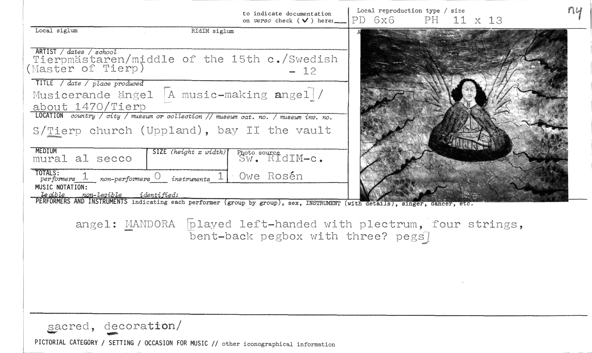 //// ny //// to indicate documentation on versa check (Ni ) here: //// Local reproduction type / size //// PD 6x6 PH 11 x 13 //// Local siglum RIdIM siglum //// ARTIST / dates / school //// Tierpmästaren/middle of the 15th c./Swedish (Master of Tierp) - 12 //// TITLE / date / place produced r_ //// Musicerande ängel A music-making angel/ about 1470/Tierp //// LOCATION country / city / museum or collection // museum cat. no. / museum inv. no. //// S/Tierp church (Uppland), bay II the vault //// MEDIUM secco SIZE (height x width) //// mural al //// W- non-perfbrmers instruments Owe Rosén //// per formers J_ //// MUSIC NOTATION: //// -1 i• e //// PERFORMERS AND INSTRUMENTS indicating //// each performer group by group sex, INSTRUMENT (with a s , s g , //// angel: MANDORA [played left-handed with plectrum, four bent-back pegbox with three? pegSj strings, //// //// //// sacred, decoration/ //// %mr //// PICTORIAL CATEGORY / SETTING / OCCASION FOR MUSIC // other iconographical information ////