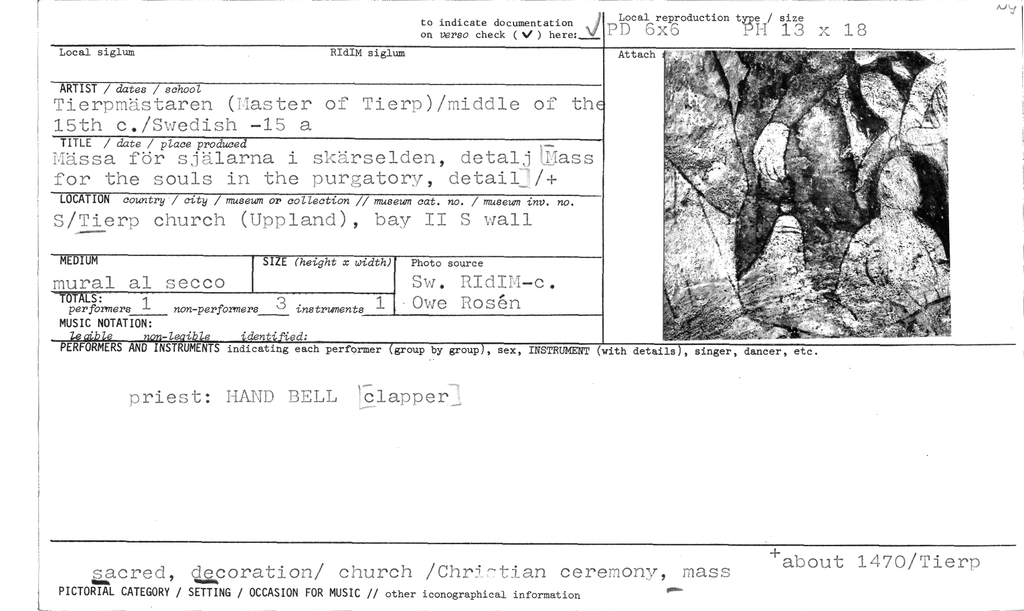 //// 1U9 //// to indicate documentation //// Local reproduction type / size //// on verso check (V ) here: PD 6x6 PH 13 x 18 //// Local siglum RIdIM siglum //// Attach //// ARTIST / dates / school //// Tierpmästaren (Master of Tierp)/middle of the 15th c./Swedish -15 a //// TITLE / date / place produced //// Mässa för själarna i skärselden, detalj lass for the souls in the purgatory, detail74 //// LOCATION country / city / museum or collection // museum cat. no. / museum tnv. no. //// S/Tierp church (Uppland), bay II S wall //// SIZE (height r width) //// 7DTALS: //// per formers non-perfOrmers instruments //// MUSIC NOTATION: //// le aible non-leaible identifi.ed; //// PERFORMERS AND INSTRUMENTS indicating each perfbrmer (group by group), sex, INSTRUMENT (with details), singer, dancer, etc. //// nriest: HAND BELL 1happer //// MEDIUM //// mural al secco //// Photo source //// Sw. RIdIM-c. Owe Rosén //// äacred, claporation/ church /Chr5.7tian ceremony, mass //// PICTORIAL CATEGORY / SETTING / OCCASION FOR MUSIC // other iconographical information //// +about 1470/Tierp ////
