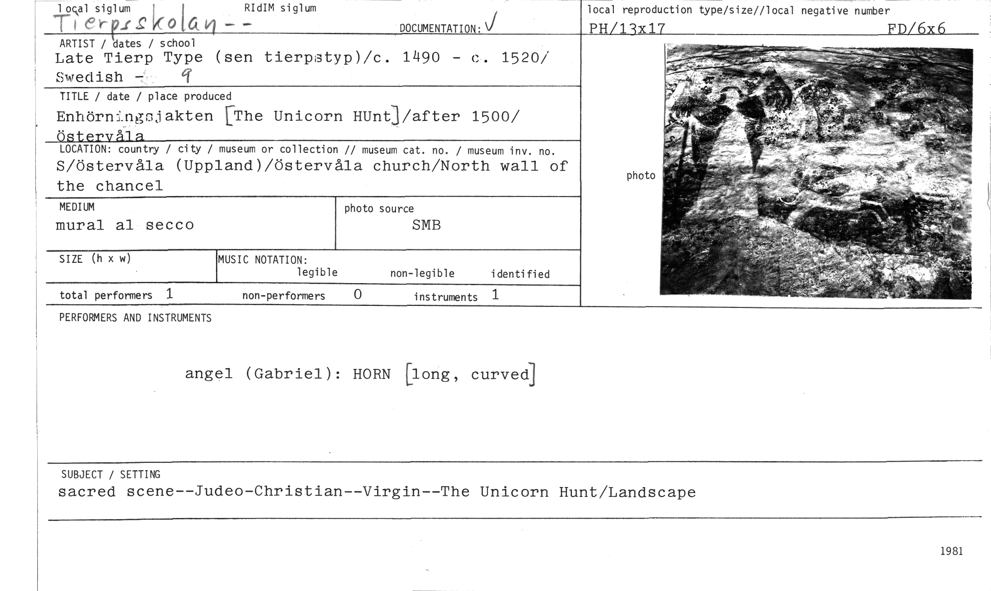 //// losal siglumi RIdIM siglum //// Telt—rjrg KOI — — //// ARTIST / dates / school //// Late Tierp Type (sen tierpstyp)/c. 1490 - c. 1520/ Swedish //// DOCUMENTATION: //// local reproduction type/size//local negative number //// PH/13x17 FD/63ch //// TITLE / date / place produced //// Enhörningnjakten [The Unicorn HUnd/after 1500/ //// öqtervåla //// LOCATION: country / city / museum or collection // museum cat. no. / museum inv. no. //// S/östervåla (Uppland)/östervåla church/North wall of the chancel //// photo //// MEDIUM //// mural al secco //// photo source //// SMB //// MUSIC NOTATION: //// legible //// non-legible identified //// instruments 1 //// PERFORMERS AND INSTRUMENTS //// angel (Gabriel): HORN [long, curved] //// SUBJECT / SETTING //// sacred scene--Judeo—Christian--Virgin--The Unicorn Hunt/Landscape //// 1981 ////