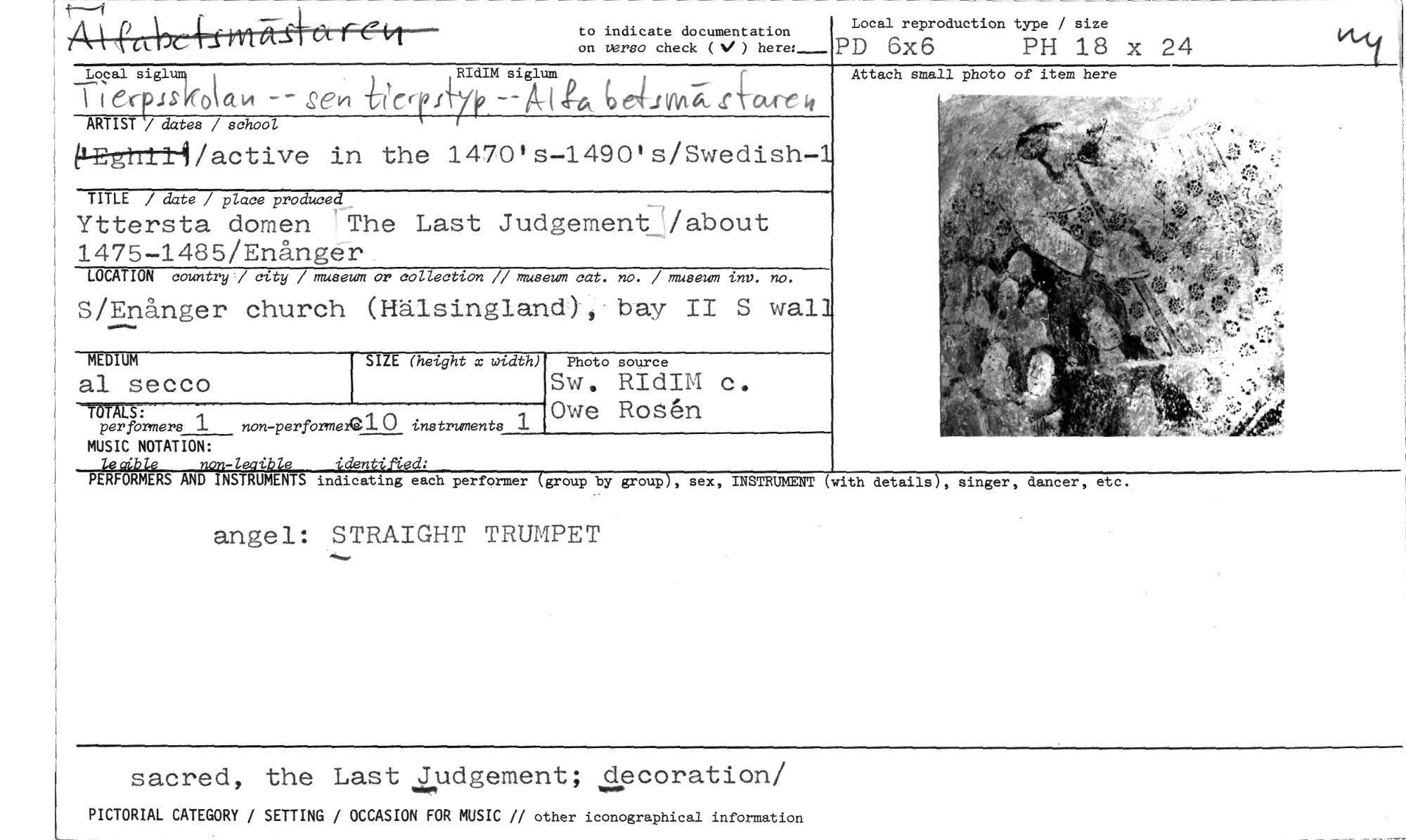 //// to indicate documentation //// Local reproduction type / size //// on verso check (V) here:- PD 6x6 PH 18 x 24 //// Local siglu9 t RIdIM siglum //// i erPisskr°\414 -6Crer7f9 -"A( 4 () A m YE-af-e-4 //// ARTIST / dater / school //// .1-E--731-t-1-1/active in the 1470's -1490's/Swedish -1 //// TITLE / date / place produced //// Yttersta domen The Last Judgementjabout 1475-1485/Enånger //// LOCATION country / city / museum or collection // museum cat. no. / museum inv. no. //// S/Enånger church (Hälsingland-), bay II S wall //// SIZE (height x width) //// -TÖTALS: //// per formers 1 non-performeR1 0 instruments //// MUSIC NOTATION: //// Zeaible nou-leaible identift.ed: //// PERFORMERS AND INSTRUMENTS indicating each performer (group by group), sex, INSTRUMENT (with details), singer, //// angel: STRAIGHT TRUMPET //// sacred, the Last Judgement; decoration/ //// PICTORIAL CATEGORY / SETTING / OCCASION FOR MUSIC // other iconographical information //// MEDIUM //// al secco //// Photo source //// Sw. RIdIM c. Owe Rosen //// Attach small photo of item here //// dancer, etc, ////