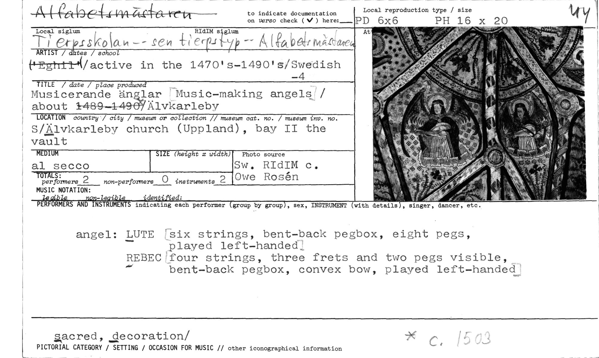 //// try //// Local sigrwni r RIdIM slglum i I , //// Ti erdefswo\ak gem 1)--t typ /A5( ect pOrp46,4,(4, //// _, //// ARTIST/ tes / school //// (-keri-9/active in the 1470's-1490's/Swedish //// -4 //// TULE / date / place produced //// Musicerande än lar Music-making angels:/ about 1-489-14 Älvkarleby //// LOCATION country./ city / museum or collection // museum cat. no. / museum inv. no. //// S/Älvkarleby church (Uppland), bay II the vault //// MUSIC NOTATION: //// e de //// P AND NSTRUMENTS indicating each performer group by group , sex, INSTRUMENT (with details singer, dancer, etc. //// angel: LUTE six strings, bent-back pegbox, eight pegs, played left-handed, //// REBEC four strings, three frets and two pegs visible, bent-back pegbox, convex bow, played left-handed //// 2,acred, decoration/ //// PICTORIAL CATEGORY / SETTING / OCCASION FOR MUSIC // other iconographical information //// SIZE (height x width) //// TOTALS: //// per formers 2 non-performers 0 instruments 2 //// Photo source //// Sw. RIdIM c. Owe Rosén //// MEDIUM //// al secco //// to indicate documentation Local reproduction type / size //// on versa check (‘I) here: PD 6x6 PH 16 x 20 //// At ////