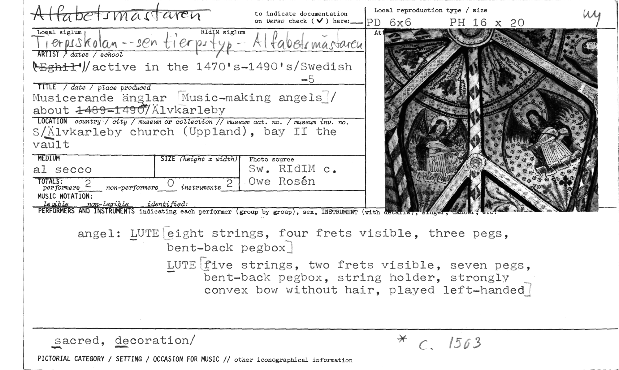 //// to indicate documentation Local reproduction type / size //// on verso check (V) here:___ Df 6x6 PH 16 x 20 //// t //// Gcs //// Losal siglumt //// lagd siglum //// ety-IS K01011 --Ser -- okAig.t..4 //// ARTIST / dates / school //// 4-ght--14)/active in the 1470's-1490's/Swedish //// -5 //// TITLE / date / place produced //// Musicerande änglar Music-making angels / about4-48--9-rtfrefttÄlvkarleby //// LOCATION country / city / museum or collection // museum cat. no. / museum inv. no. //// S/Älvkarleby church (Uppland), bay II the yault //// SIZE (height x width) //// -7UTALS: //// per formers 2non-perfarmers () instruments MUSIC NOTATION: //// / i• e 'dant' ied: //// AND INSTRUMENTS indicating each performer group by group , sex, INSTRUMENT (with //// angel: LUTE!eight strings, four frets visible, three pegs, bent-back pegboxj //// LUTEz rfive strings, two frets visible, seven pegs, bent-back pegbox, string holder, strongly convex bow without hair, played left-handed //// MEDIUM //// al secco //// PE FORMERS //// Photo source //// SW. RIdIM c. Owe Rosén //// sacred, decoration/ * c, 1563 //// PICTORIAL CATEGORY / SETTING / OCCASION FOR MUSIC // other iconographical information ////