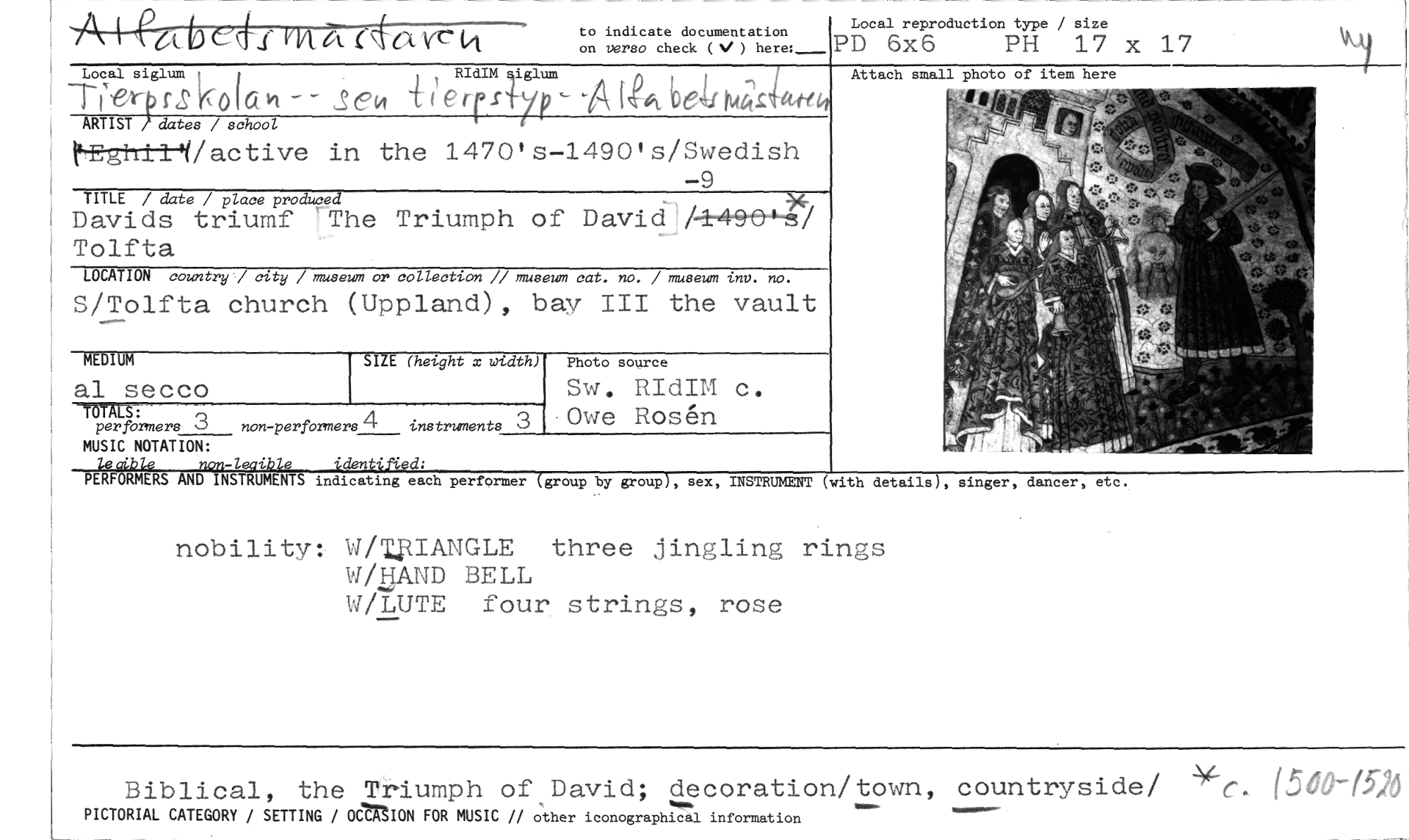 //// to indi care documentation //// Local reproduction type / size //// on versa check (V) here: PD 6x6 PH 17 x 17 //// Local siglum i , RiumAigium //// -1-1`sertp fs la - 2 eo i errs9p- pviä-tt,te4 //// --ARTIST / dates / school //// tiEghilVactive in the 1470's-1490's/Swedish //// -9 //// TITLE / date / place produced //// Davids triumf The Triumph of David /14901-3/ Tolfta //// LOCATION country / city / museum or collection // museum cat. no. / museum viv. no. //// S/Tolfta church (Uppland), bay III the vault //// //// MEDIUM SIZE (height x width) //// al secco //// TOTALS: non-perfortners l',iP e dent 4 instruments 3 //// perfbrners 3 //// MUSIC NOTATION: d• //// %I //// Attach small photo of item here //// Photo source //// Sw. RIdIM c. Owe Rosén //// INSTRUMENTS indicating each performer //// group by group , sex, INSTRUMENT (with details), singer, dancer, etc. //// PERFORMERS AND //// nobility: WP4kIANGLE three jingling rings W/ HAND BELL //// W/LUTE four strings, rose //// Biblical, the Triumph of David; decoration/town, countryside/ ffc. (540-6,26 //// PICTORIAL CATEGORY / SETTING / OanION FOR MUSIC // other iconographical information ////