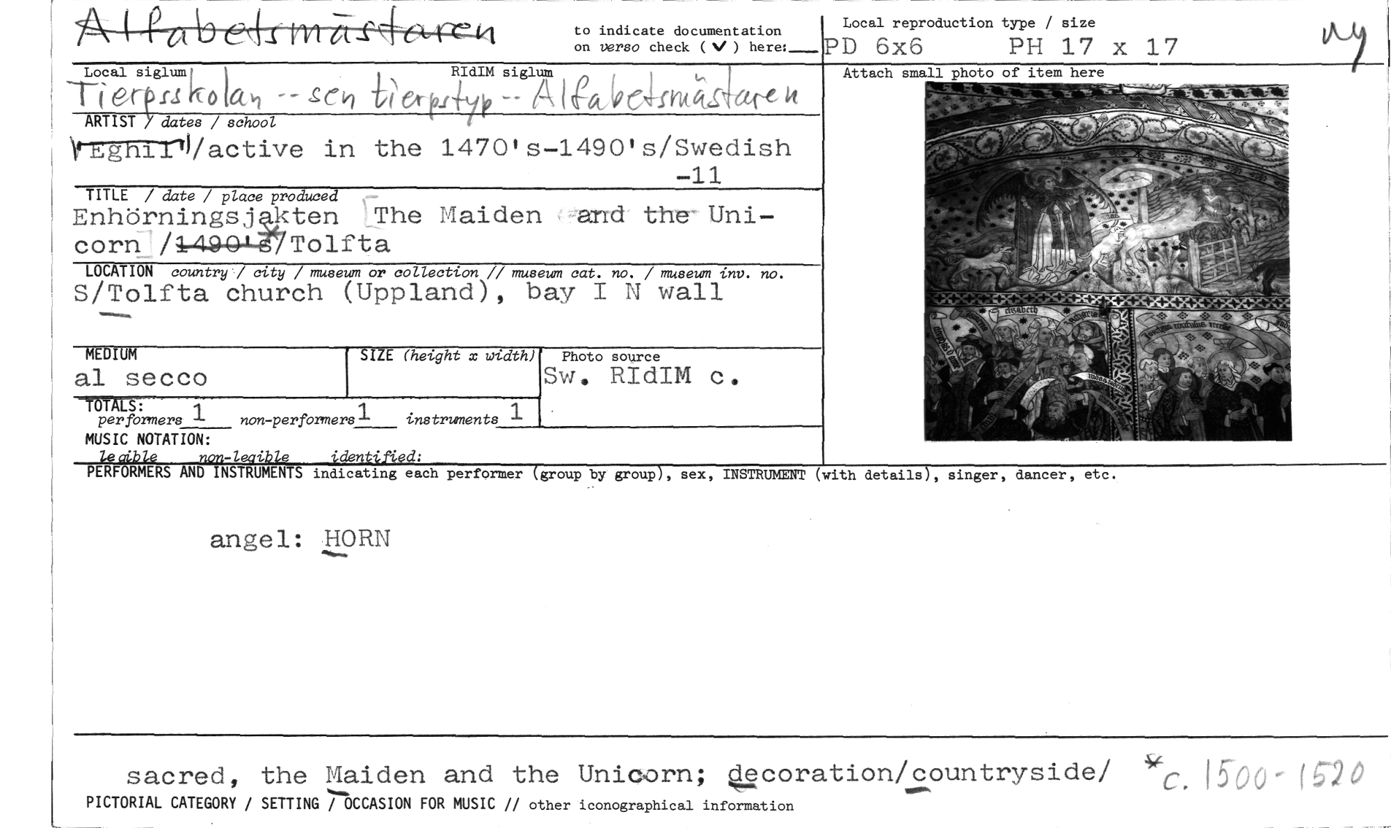 //// to indicate documentation on verso check (NI ) here: //// Local reproduction type / size //// PD 6x6 PH 17 x 17 //// Local siglum l I RIdIM siglum //// erp KO Al &iK.,1-104<rtctre, //// ARTIST y dates / school //// Y.t.gnilli/active in the 1470's-1490's/Swedish //// -11 //// TITLE / date / place produced //// Enhörnings, kten The Maiden <>-and the-Unicorn / Tolfta //// LOCATION country / city / museum or collection // museum cat. no. / museum tnv. no. //// S/Tolfta church (Uppland), bay I N wall //// Photo source //// SW. RIdIM c. //// angel: HORN //// MEDIUM //// al secco //// SIZE (height x width) //// Attach small photo of item here //// MALS: //// per formers 1 non-perforners1 instruments //// MUSIC NOTATION: //// tåbIe non-leaible identified: //// PE FORMERS AND INSTRUMENTS indicating each performer (group by group), sex, INSTRUMENT (with details), singer, dancer, etc. //// sacred, the Maiden and the Unicorn; 412coration/countryside/ C 15-00. (6-20. //// PICTORIAL CATEGORY / SETTING / OCCASION FOR MUSIC // other iconographical information ////