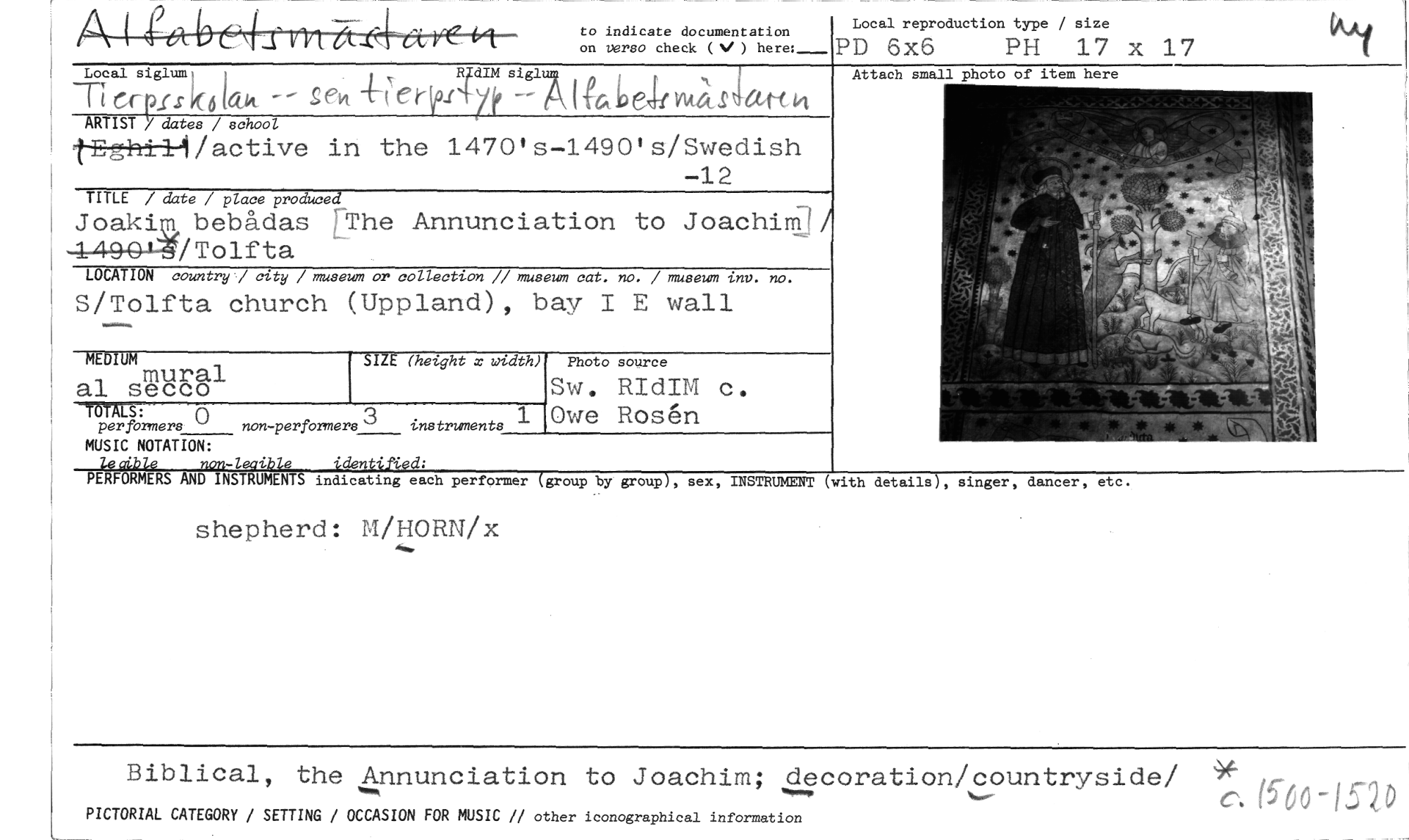 //// to indicate documentation //// on versa check ( ) here: //// Local reproduction type / size //// PD 6x6 PH 17 x 17 //// siglul //// `5614 (ei1P-r9i# -- A (fabel/ Initbsctt-‹ //// in the 1470's-1490's/Swedish //// -12 //// TITLE / date / place produced //// Joaki bebådas 'The Annunciation to Joachim:/ /Tolfta //// 7=7Srn non-performers 3 instruments 1 Owe Rosen //// per formers //// MUSIC NOTATION: //// leaib/e non-leaible identified: //// LOCATION country] city / museum or collection // museum cat. no. / museum inv. no. //// S/Tolfta church (Uppland), bay I E wall //// MEDIUM SIZE (height x width) Photo source //// mural al secco Sw. RIdIM c. //// //// Local siglum, //// -1-"t crpss k-6 lak -- //// ARTIST / dates / school //// /active //// Attach small photo of item here //// PERFORMERS AND INSTRUMENTS indicating each performer (group by group), sex, INSTRUMENT (with details), singer, dancer, etc. //// shepherd: M/HORN/x //// Biblical, the Annunciation to Joachim; decoration/countryside/ c. (5'60 -152,0 //// PICTORIAL CATEGORY / SETTING / OCCASION FOR MUSIC // other iconographical information //// ////