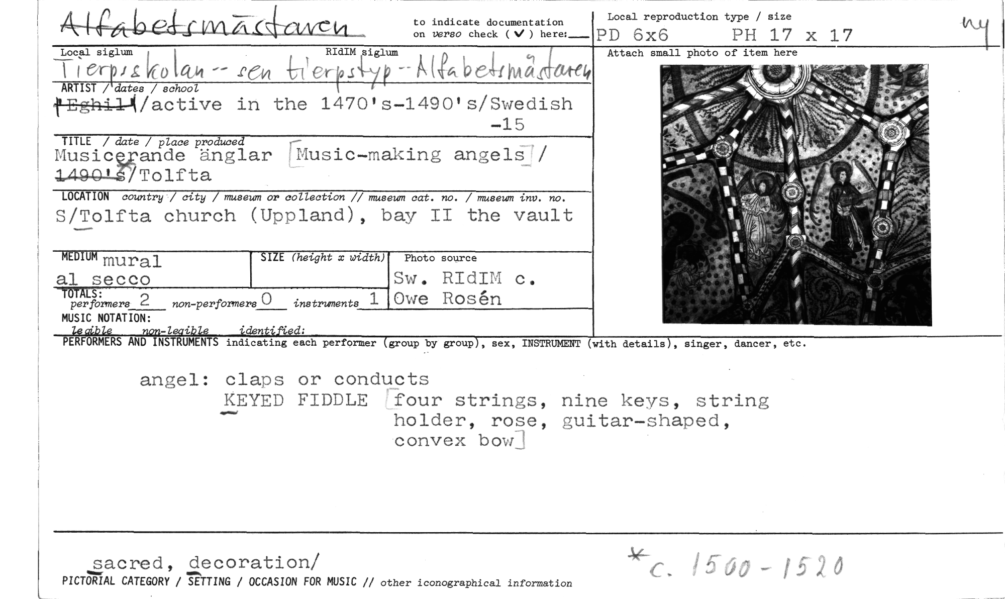 //// to indicate documentation on versa check (N/ ) here: //// Local reproduction type / size //// PD 6x6 PH 17 x 17 //// Local siglum //// ARTIST / dates / school //// C--r) iglf0 14,k •rei4 .6ter-,914-p -- /3\ (4,e•tr m `it //// RIdIM siglum //// fEghilli/active in the 1470's-1490's/Swedish //// -15 //// TITLE / date / place produced //// Music ande änglar Music-making angels / ' Tolfta //// LOCATION country / city / museum or collection // museum cat. no. / museum tnv. no. //// S/Tolfta church (Uppland), bay II the vault //// MEDIUM mural //// instruments 1 //// MUSIC NOTATION: //// lecible non-lecible identified; //// PERFORMERS AND INSTRUMENTS indicating each performer (group by group), sex, //// angel: claps or conducts //// KEYED FIDDLE tfour strings, nine keys, string holder, rose, guitar-shaped, convex bow] //// al secco //// TOTALS: //// per formers 2 non -perfOrmers //// SIZE (height x width) //// Sw. RIdIM c. Owe Rosen //// Photo source //// Attach small photo of item here //// INSTRUMENT (with details), singer, dancer, etc. //// sacred, decoration/ //// PICTORIAL CATEGORY / SETTING / OCCASION FOR MUSIC // other iconographical information //// c. 1560 /5 2 ö ////