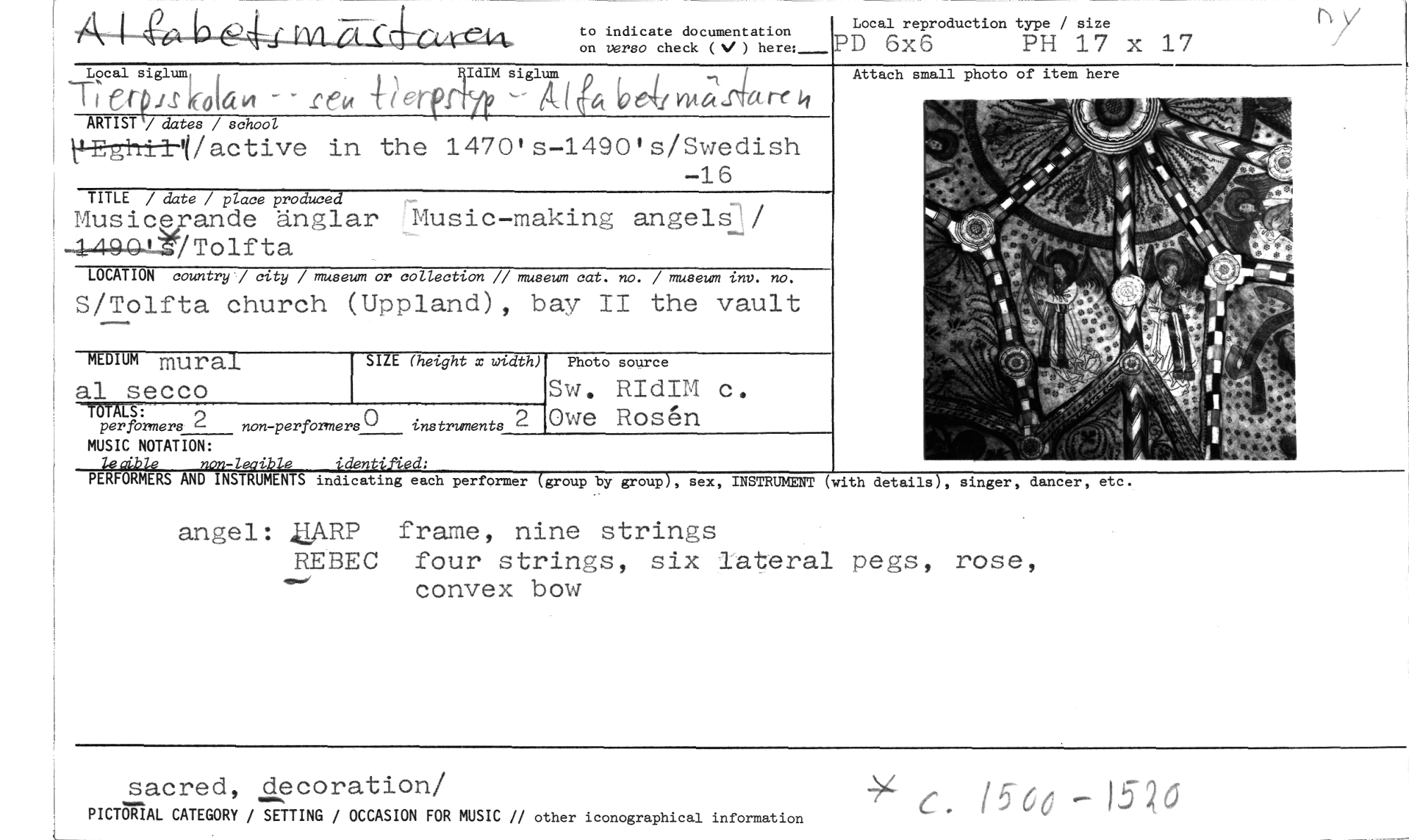 //// to indicate documentation //// on versa check ( ) here:_ //// Local reproduction type / size //// PD 6x6 PH 17 x 17 //// F719 sig 41 (941 YktjtAre h //// IdIM um //// Local siglum, i //// Tt el-PS 11016 rec< //// ARTIST / dates / school //// 14-Eg1r1lli/active in the 1470,s-14901s/Swedish //// -16 //// TITLE / date / place produced //// Musiceande änglar Music-making angels I /Tolfta //// LOCATION country / city / museum or collection // museum cat. no. / museum vnv. no. //// S/Tolfta church (Uppland), bay II the vault //// SIZE (height x width) //// MUSIC NOTATION: //// lecible non-leaikle identilUd: //// PERFORMERS AND INSTRUMENTS //// Attach small photo of item here //// MEDIUM mural al secco //// TOTALS: //// per formers 2 //// non-performers0 instruments 2 //// Sw. RIdIM c. Owe Rosén //// Photo source //// indicating each performer (group by group), sex, INSTRUMENT (with details), singer, dancer, etc. //// angel: ZARP frame, nine strings //// REBEC four strings, six lateral pegs, rose, convex bow //// sacred, decoration/ //// PICTORIAL CATEGORY / SETTING / OCCASION FOR MUSIC // other iconographical information //// 15-66 - 15 ////