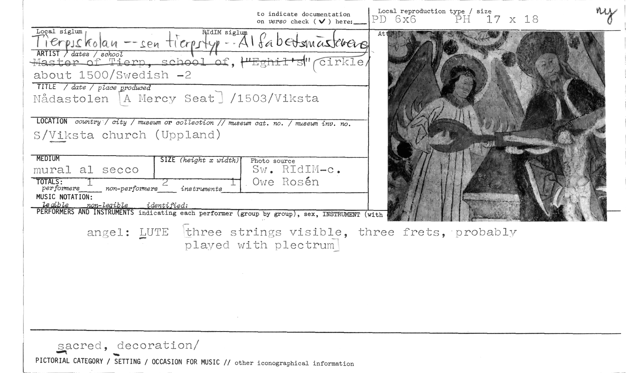 //// to indicate documentation Local reproduction type / size //// on versa check (V) here:__-- PD 6x6 PH 17 x 18 //// Lo siglum i dIM sigl //// Ti1-um //// -erpir ko la lem cr- - - A gai b (4..stii.67 //// ARTIST datea / school //// tuitpti-1-4-,*(birkle/ //// TITLE /clate/plampvcIumd //// Nådastolen LA Mercy Seat] /1503/Viksta //// LOCATION country./ city / museum or collection // museum cat. no. / museum tnv. no. //// S/Viksta church (Uppland) //// SIZE (height x width) //// 1111=-7- //// per formers non-performers instruments //// MUSIC NOTATION: //// -1 i• e den d: //// PERFORMERS AND INSTRUMENTS indicating each performer group by group , sex, INSTRUMENT (with //// At //// about 1500/Swedish — //// 2 //// Photo source //// RIdIM—c. Owe Rosen //// angel: LUTE three strings visible, three frets, probably played with plectruj //// sacred, decoration/ //// PICTORIAL CATEGORY / SETTING / OCCASION FOR MUSIC // other iconographical information //// WO" //// MEDIUM //// mural al secco ////