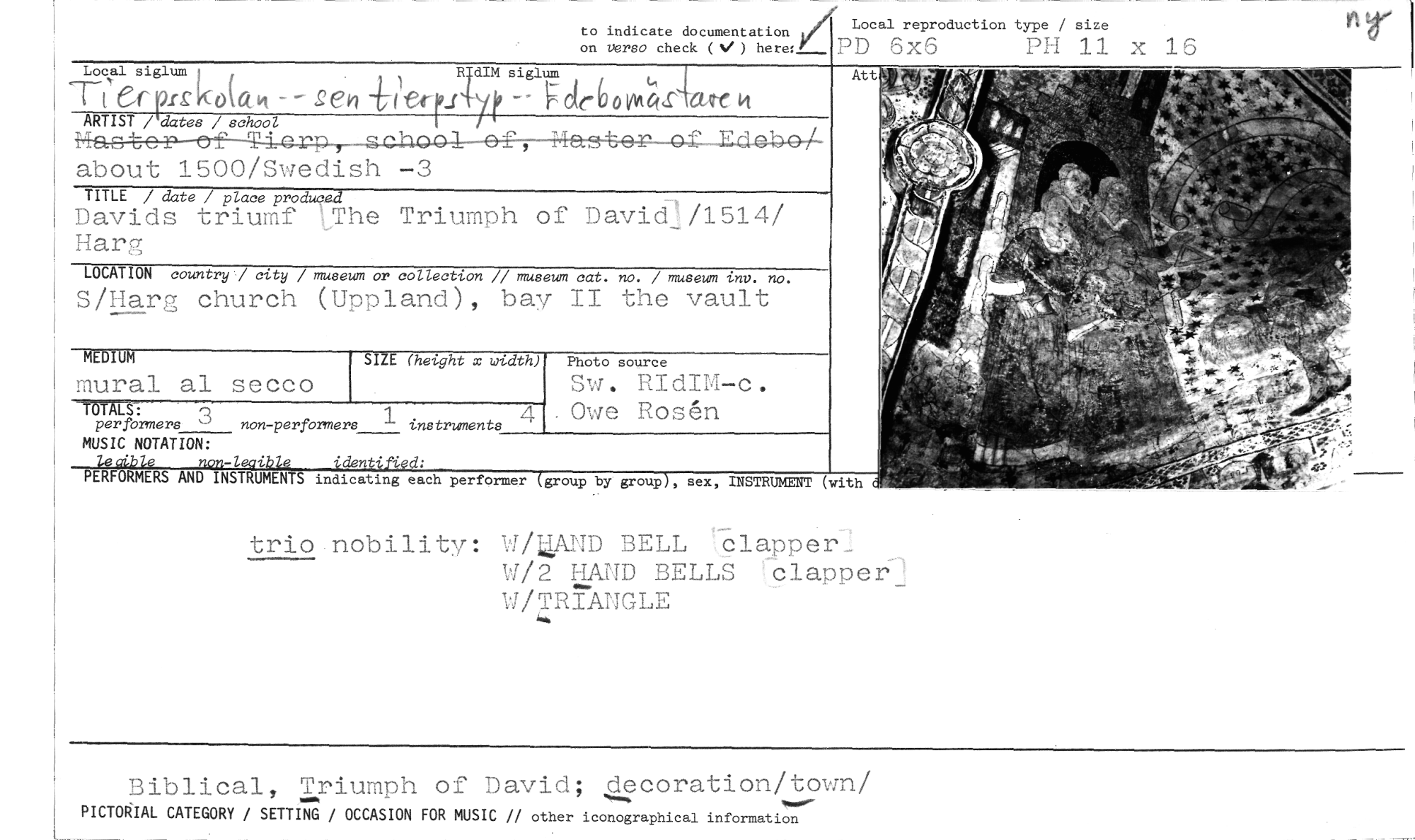 //// to indicate documentation Local reproduction type / size //// on verso check (/) here:g:: //// PD 6x6 PH 11 x 16 //// trio nobility: W/UAND BELL clapper_ //// W/2 HAND BELLS clapper-' WIRTÅNGLE //// Biblical, Triumph of David; decoration/town/ //// PICTOKIAL CATEGORY / SETTING / OCCASION FOR MUSIC // other iconographicai information //// -1 //// den //// group by group //// , sex, INSTRUMENT (with //// PERFORMERS AND INSTRUMEN indicating each performer //// Local sigium R dIMsiglum //// TI Cr lur ko(&K -- gen rerri—yl• -- / o MCW-CtAte //// ARTIST / dates / school //// about 1500/Swedish -3 //// TITLE / date / place produced- //// Davids triumf ;The Triumph of David1/1514/ Harg //// LOCATION country / city / museum or collection // museum cat. no. / museum tnv. no. //// S/Harg church (Uppland), bay II the vault //// MEDIUM //// mural al secco //// per formers non-performers 1 instruments //// MUSIC NOTATION: //// Photo source //// SV/. RIdIM-c. Owe Rosén //// =ALS //// : //// SIZE fhetght x width) //// nr ////