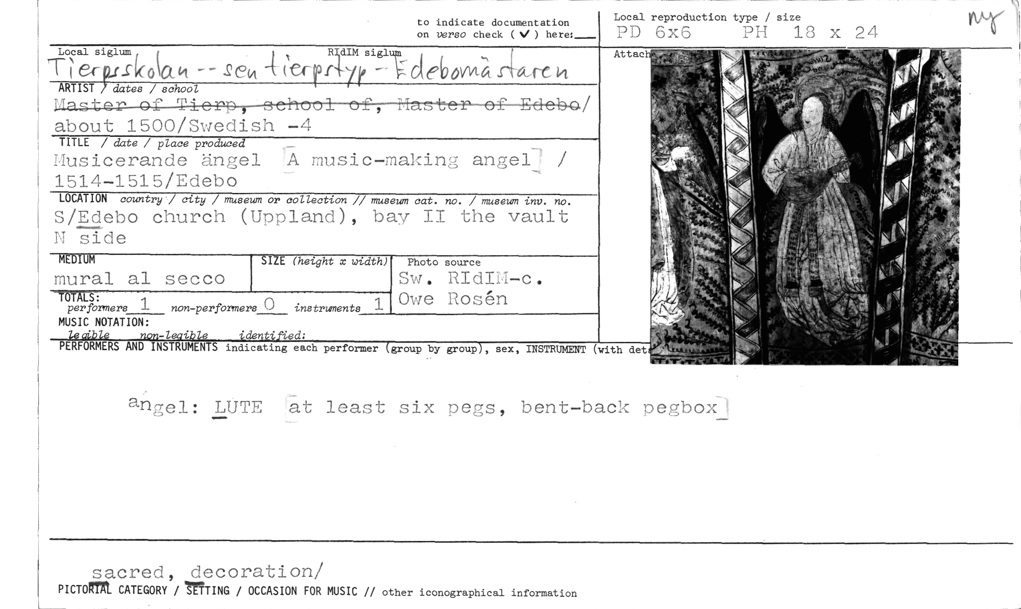//// to indicate documentation //// on verso check (d) here:___ //// Local reproduction type / size //// PD 6x6 PH 18 x 24 //// Local sigl sko~Q //// S4rA/rt //// -Qat (erefili° Cebe)1(1/141- //// ARTIST/dat« / school //// about 1500/Swedish -4 //// TITLE / date / place produced //// Musicerande ängel A music-making angel 1514-1515/Edebo //// LOCATION country./ city / museum or collection // museum cat. no. / museum inv. no. //// S/Edebo church (Uppland), bay II the vault N side //// Attac //// MEDIUM //// mural al secco //// ":Sperfrrmert 1 MUSIC NOTATION: //// SIZE (height x width) //// non-performers 0 instruments l //// Photo source //// Sw. RIdIM-c. Owe Rosén //// l i e den //// ORMERS D NSTRUMEN S indicating each performer group by group , sex, INSTRUMENT (with det //// angel: LUTE at least six pegs, bent-back pegboxl //// 1.¥1.47. //// sacred, decoration/ //// picTorrxt CATEGORY / 'TING / OCCASION FOR MUSIC // other iconographical information ////