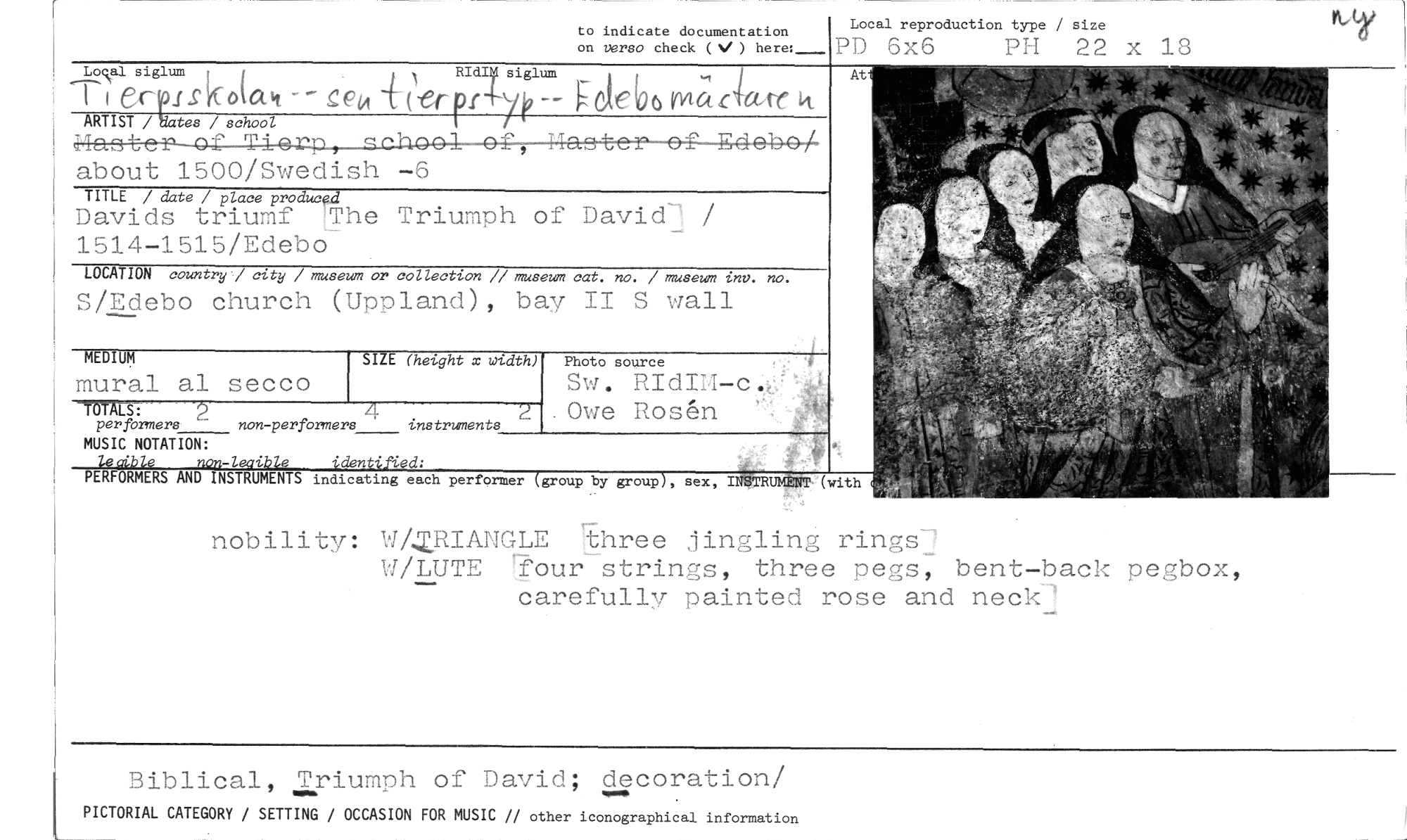 //// nobility: WAZRIANGLE three jingling rings) //// W/LUTE rtour-strings, three pegs, bent-back pegbox, carefully painted rose and neckl //// Biblical, Triumph of David; decoration/ //// PICTORIAL CATEGORY / SETTING / OCCASION FOR MUSIC // other iconographical information //// to indicate documentation //// on versa check (V) here:_ //// eirioisKo^cot -- sem Teerpf-l-yi,-- eitebt, rnar1a4t" k //// Losal siglum I siglum i //// ARTIST /hatea / school //// about 1500/Swedish -6 //// TITLE / date / place producgd //// Davids triumf !The Triumph of David-1 1514-1515/Edebo //// LOCATION country / city / museum or collection // museum cat. no. / museum tnv. no. //// S/Edebo church (Uppland), bay II S wall //// MEDIUM //// mural al secco //// spe-TOTAIS 2 4 . //// ormers non-performers instruments //// MUSIC NOTATION: //// ledble non-leaible identified; //// Local reproduction type / size //// PD 6x6 PH 22 x 18 //// A //// SIZE (hetght x width) //// Photo source //// Sw. RIdIH-c. Owe Rosén //// PERFORMERS AND INSTRUMENTS indicating each performer (group by group), sex, INSTRUMENT (with ////