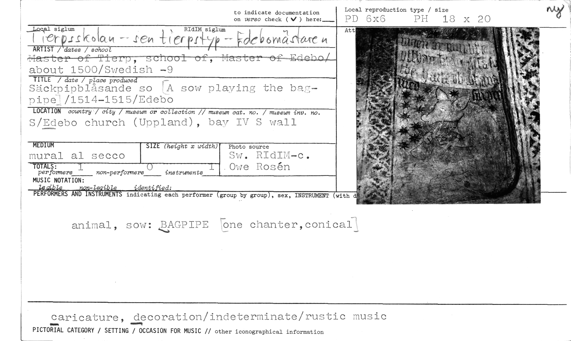 //// animal, sova: BAGPIPE one chanter,conical\ //// caricature, decoration/indeterminate/rustic music //// PICTORIAL CATEGORY / SETTING / OCCASION FOR MUSIC // other iconographical information //// to indicate documentation on versa check ( ) here: //// Local reproduction type / size //// PD 8x5 P H 18 x 20 //// ...Idacflsiglum1 //// -e4-9.rsKolcon -Deo (er- r //// I //// ARTIST / dater / school //// about 1500/Swedish -9 //// TITLE / date / place produced //// Säckpipblasande so A sow playing the bad -pipe:/1514-1515/Edebo //// LOCATION country./ city / museum or collection // museum cat. no. / museum inv. no. //// S/Edebo church (Uppland), bay IV S wall //// MEDIUM //// mural al secco //// -«"="---3. (3 //// per formers non-performers instruments //// MUSIC NOTATION: //// lecible non-leaible ..dentin.ed; //// SIZE (height x width) //// Photo sol4.ce //// Sw. RIdIM-c. Owe Rosen //// PERFORMERS AND INSTRUMENTS indicating each performer (group by group), sex, INSTRUMENT (with ////