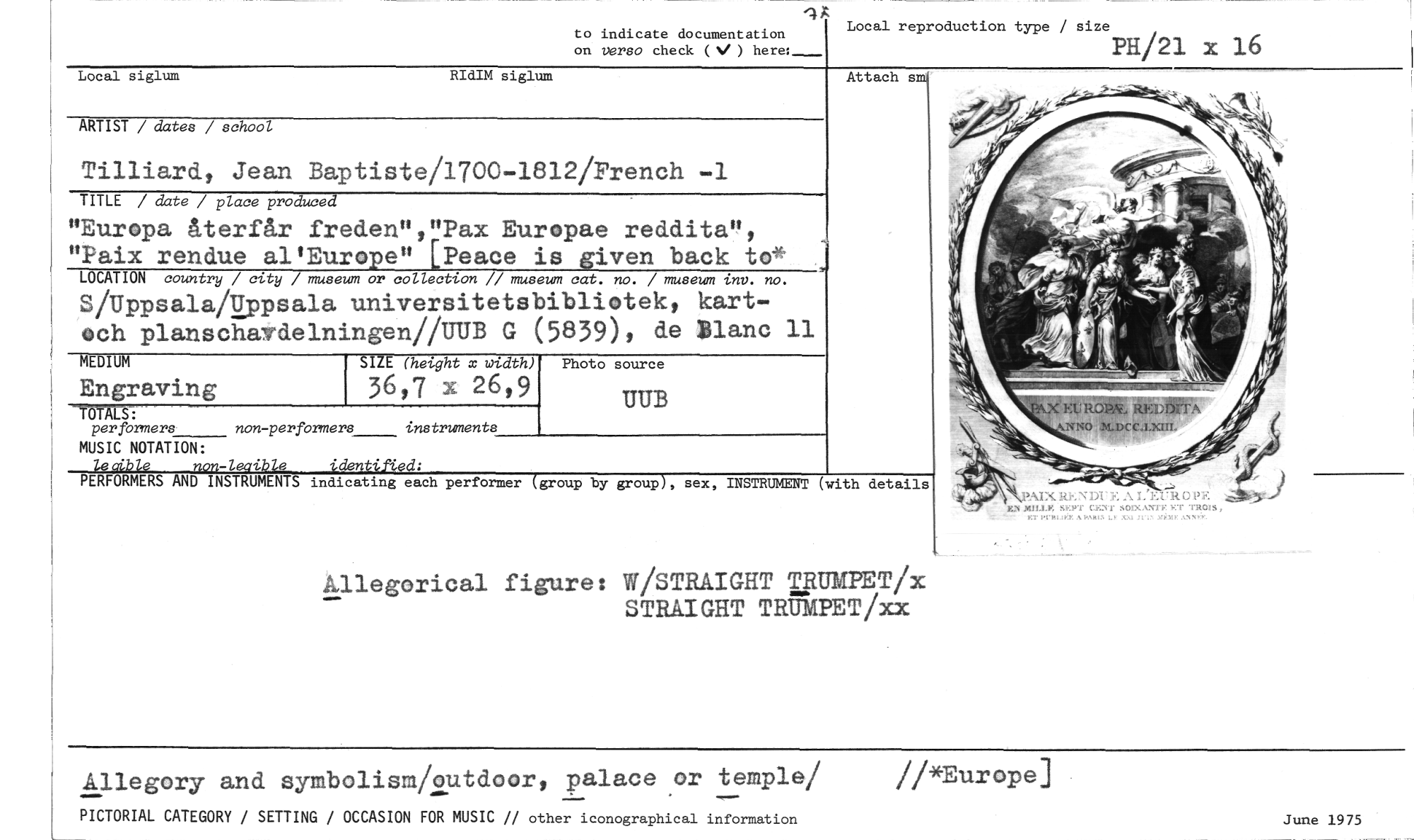 //// Local siglum //// RIdIM siglum //// '4X //// to indicate documentation on verso check (V ) here: //// Local reproduction type / size //// PH/21 x 16 //// Attach sni //// ARTIST / dates / school //// Tilliard, Jean Baptiste/1700-1812/Prench -1 //// TITLE / date / place produced //// "Europa återfår freden","Pax Europae reddita", "Paix rendue al'Europe" [Peace is given back to* //// LOCATION country / city / museum or collection // museum cat. no. / museum inv. no. //// S/Uppsala/Mppsala universitetsbibliotek, kart-och planschavdelningen/PUB G (5839), de Blanc 11 //// MEDIUM SIZE (height x width) Photo source //// Engraving 36,7 x 26,9 //// UUB //// TOTALS: //// per formers non-performers instruments //// //// MUSIC NOTATION: //// leaible non-leoihle identified: //// PERFORMERS AND INSTRUMENTS indicating each performer (group //// by group), sex, INSTRUMENT (with details //// kllegorical figure: W/STRAIGHT TRUMPET/x //// STRAIGHT TRUMPET/xx //// Allegory and symbolism/outdoor, palace or temple/ //*Europe] //// • --- //// PICTORIAL CATEGORY / SETTING / OCCASION FOR MUSIC // other iconographical information //// June 1975 ////