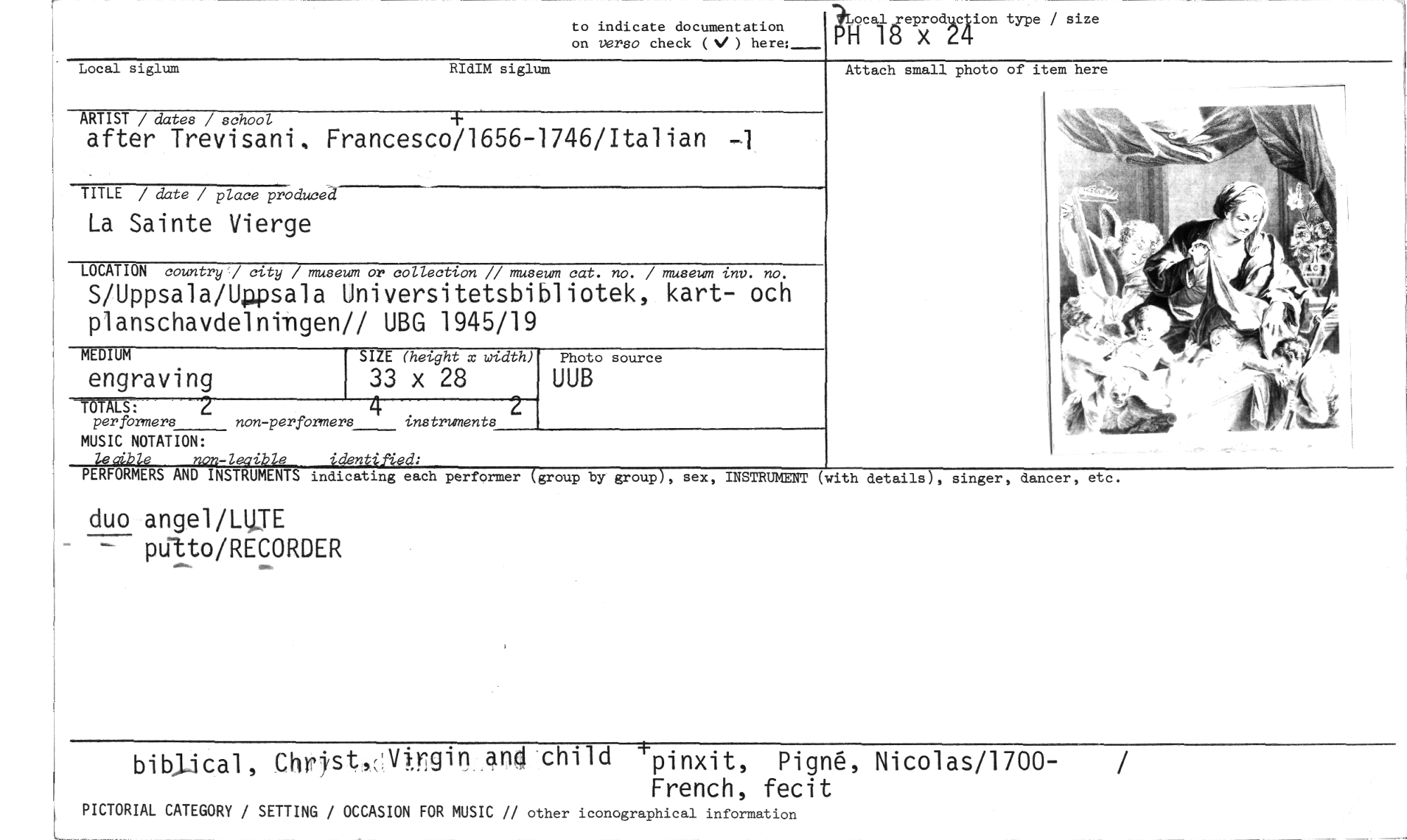 //// to indicate documentation //// on Versa check (V ) here:_ //// ocaljreduction type / size //// L 18 x pro 24 //// Local siglum RIdIM siglum //// ARTIST / dates / school //// after Trevisani, Francesco/1656-1746/Italian //// TITLE / date / place produced //// La Sainte Vierge //// LOCATION country '/ city / museum or collection // museum cat. no. / museum inv. no. //// S/Uppsala/Uppsala Universitetsbibliotek, kart- och planschavdelnimgen// UBG 1945/19 //// MEDIUM SITS (height x width) Photo source //// engraving 33 x 28 UUB //// //// OT17--"M2 //// 4 //// per formers non-performers instruments //// MUSIC NOTATION: //// le alble non-leafibie identified: //// PERFORMERS AND INSTRUMENTS indicating each //// performer (group by group), sex, INSTRUMENT (with details), singer, dancer, //// etc. //// Attach small photo of item here //// duo angel/L1.LTE //// — ptitto/RECORDER //// ChOst,;:Virgin,and child +pinxit, Pig0, Nicolas/1700- //// French, fecit //// PICTORIAL CATEGORY / SETTING / OCCASION FOR MUSIC // other iconographical information ////