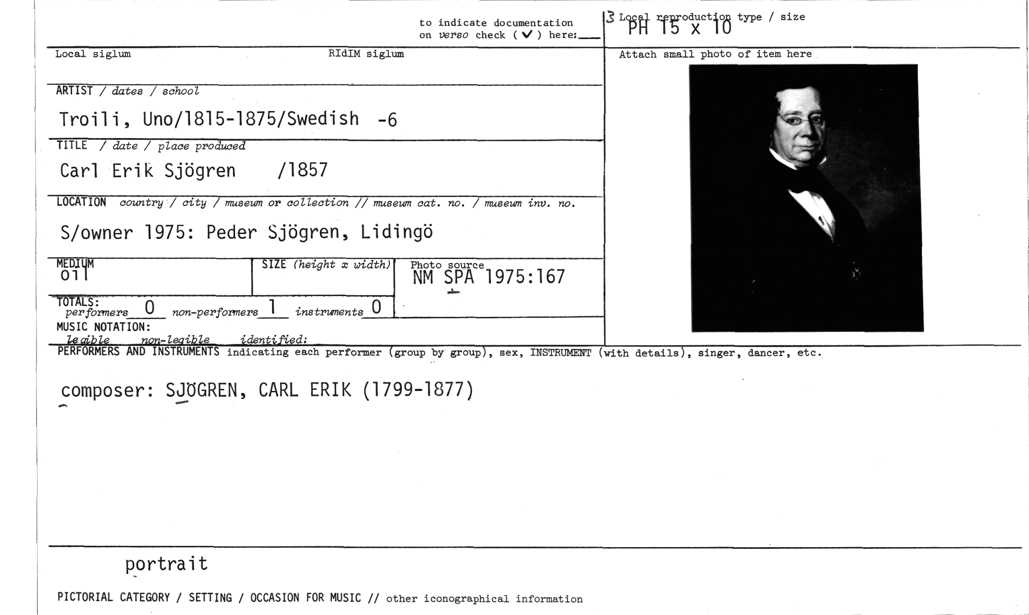 //// 3154 type / size //// to indicate documentation on verso check (V ) here: //// Local siglum RIdIM siglum //// Attach small photo of item here //// ARTIST / dates / school //// Troili, Uno/1815-1875/Swedish -6 //// TITLE / date / place produced //// Carl Erik Sjögren /1857 //// LOCATION country / city / museum or collection // museum cat. no. / museum tnv. no. //// S/owner 1975: Peder Sjögren, Lidingö //// MEDIUM //// 01 //// SIZE (height x width) //// POW1975:167 //// TOMS: //// per formers L non-performers 1 instruments 0 //// MUSIC NOTATION: //// iealble nan-legible identified; //// PERFORMERS AND INSTRUMENTS indicating each performer (group by group), sex, INSTRUMENT (with details), singer, dancer, etc. //// composer: SJÖGREN, CARL ERIK (1799-1877) //// portrait //// PICTORIAL CATEGORY / SETTING / OCCASION FOR MUSIC // other iconographical information ////