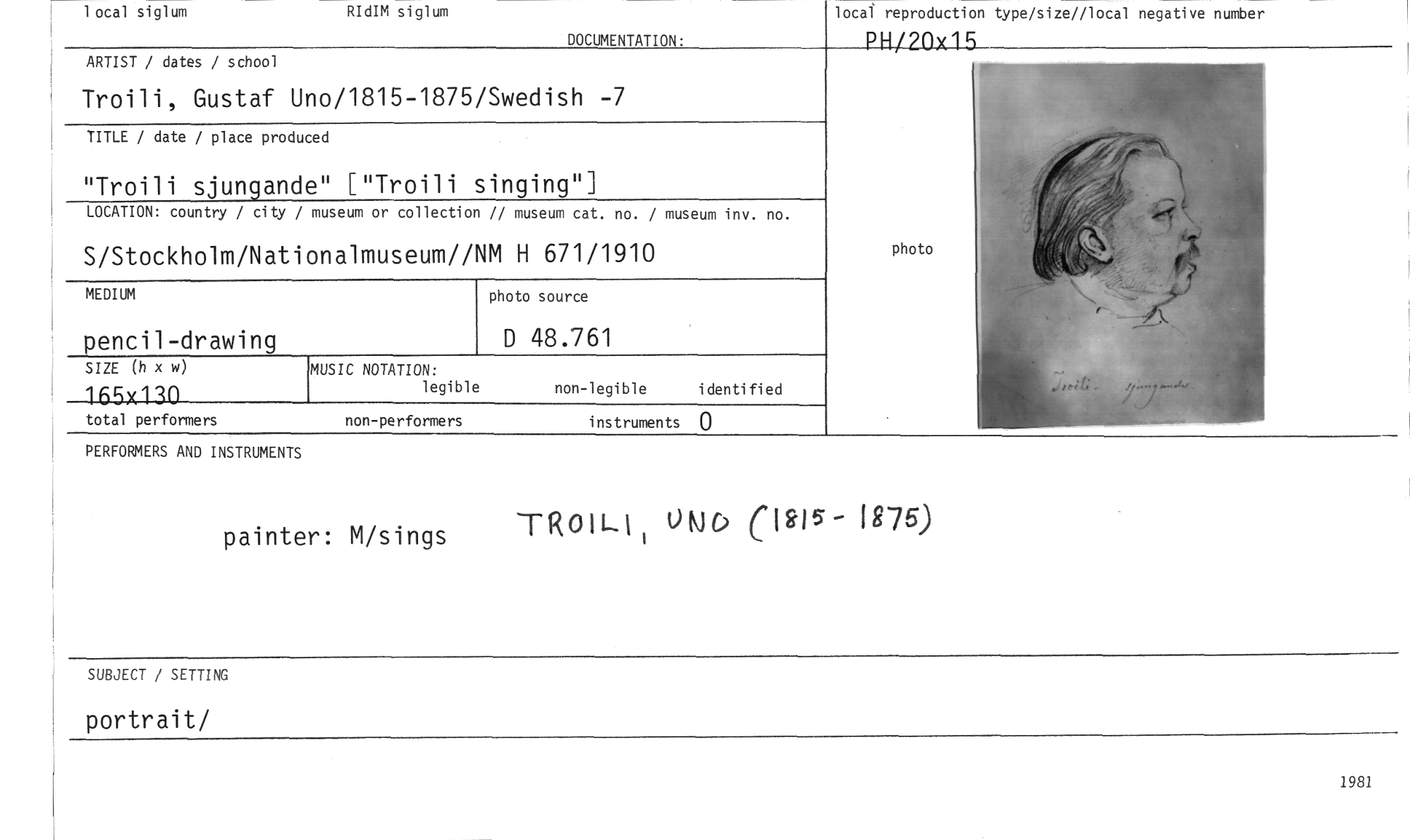 //// 1981 //// PERFORMERS AND INSTRUMENTS //// painter: M/sings //// TROILI (Mb (ms_ iris) //// SIZE (h x w) //// 16x130 //// total performers //// locai reproduction type/size//local negative number //// PH/20x15 //// DOCUMENTATION: //// ARTIST / dates / school //// Troili, Gustaf Uno/1815-1875/Swedish -7 //// TITLE / date / place produced //// "Troili sjungande" ["Troili singing"] //// LOCATION: country / city / museum or collection // museum cat. no. / museum inv. no. //// S/Stockholm/Nationalmuseum//NM H 671/1910 //// MUSIC NOTATION: //// legible non-legible identified //// non-performers instruments 0 //// photo //// RIdIM siglum //// 1 ocal siglum //// MEDIUM //// pencil-drawing //// photo source //// D 48.761 //// SUBJECT / SETTING //// portrait/ ////