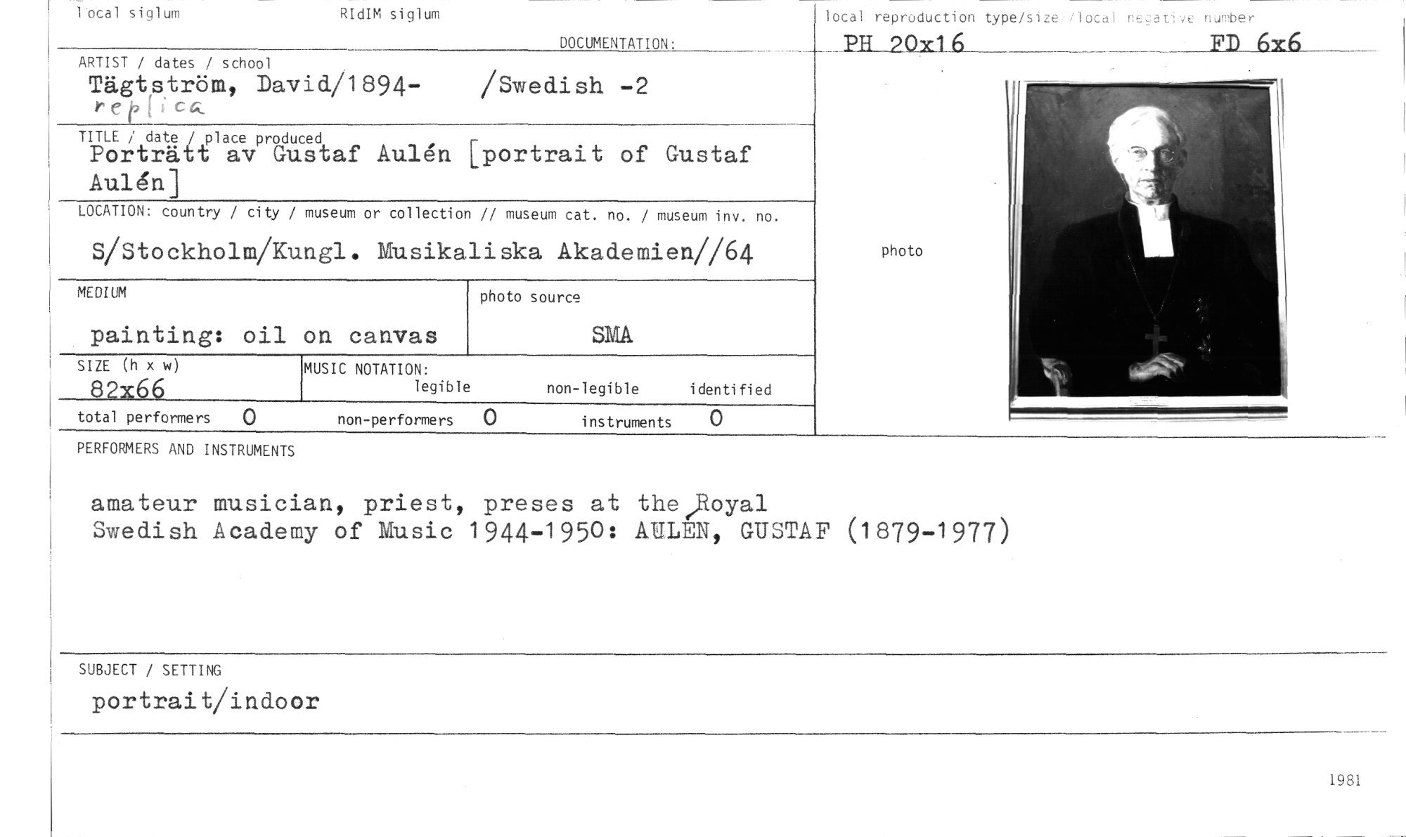 //// l otal siglum RldlM siglum //// DOCUMENTATION: //// lotal repruduction type/size 'DC //// P11_20x16 a her //// FD 6Y6 //// ARTIST / dates / school //// Tägtström, David/1894- /Swedish -2 //// res° , cc, //// TITLE / date / place produced //// Porträtt av Gustaf Aulan [portrait of Gustaf Aul4n] //// LOCATION: country / city / //// S/Stockholm/Ku //// MEDIUM //// painting: oil //// SIZE (h x w) //// 82x66 //// total performers 0 //// ngl. Musikaliska Akademien//64 //// on canvas //// MUSIC NOTATION: //// legible //// photo source //// non-legible identified //// SMA //// non-parformers 0 //// instruments //// 0 //// photo //// museum or collection // museum cat. no. / museum inv. no. //// PERFORMERS AND INSTRUMENTS //// amateur musician, priest, preses at the)ioyal //// Swedish Academy of Music 1944-1950: AULEN, GUSTAF (1879-1977) //// SUBJECT / SETTING //// portrait/indoor //// 1981 ////