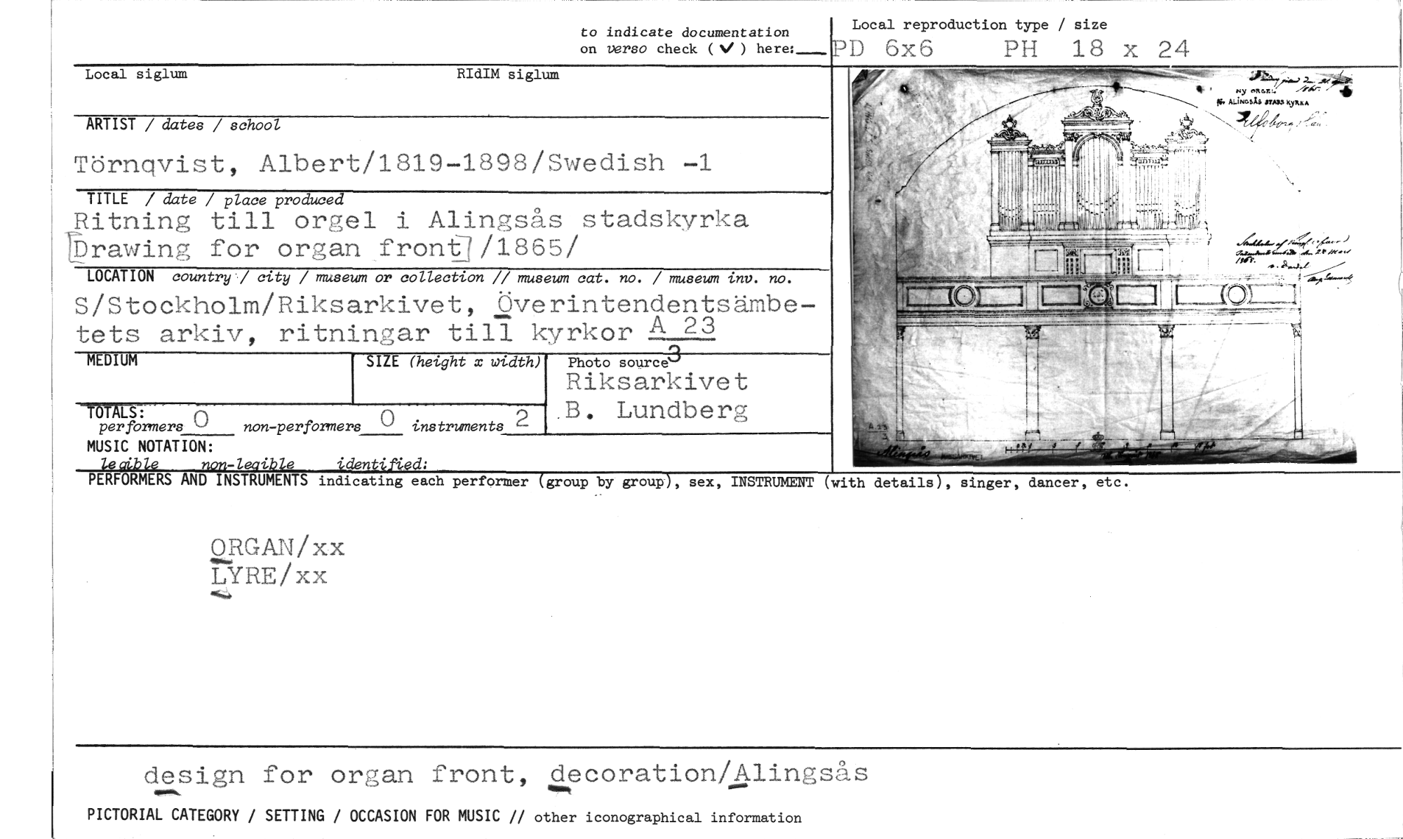 //// to indicate documentation //// on versa check ( ) here: //// Local reproduction type / size //// PD 6x6 PH 18 x 24 //// Local siglum RIdIM siglum //// ARTIST / dates / school //// Törnqvist, Albert/1819-1898/Swedish -1 //// TITLE / date / place produced //// Ritning till orgel i Alingsås stadskyrka brawing for organ front1/1866/ //// LOCATION country / city / museum or collection // museum cat. no. / museum inv. no. //// S/Stockholm/Riksarkivet, Överintendentsämbetets arkiv, ritningar till kyrkor 1.12 //// MEDIUM //// ORGAN/xx LYRE/xx //// SIZE (hetght x width) //// Photo source //// Riksarkivet //// B. Lundberg //// singer, dancer, etc. //// per formers 0 non-perfbrmers C) instruments 2 //// MUSIC NOTATION: //// non-leaible identified; //// PERFORMERS AND INSTRUMENTS indicating each performer (group by group), sex, INSTRUMENT (with details) //// design for organ front, decoration/Alingsås //// PICTORIAL CATEGORY / SETTING / OCCASION FOR MUSIC // other iconographical information ////