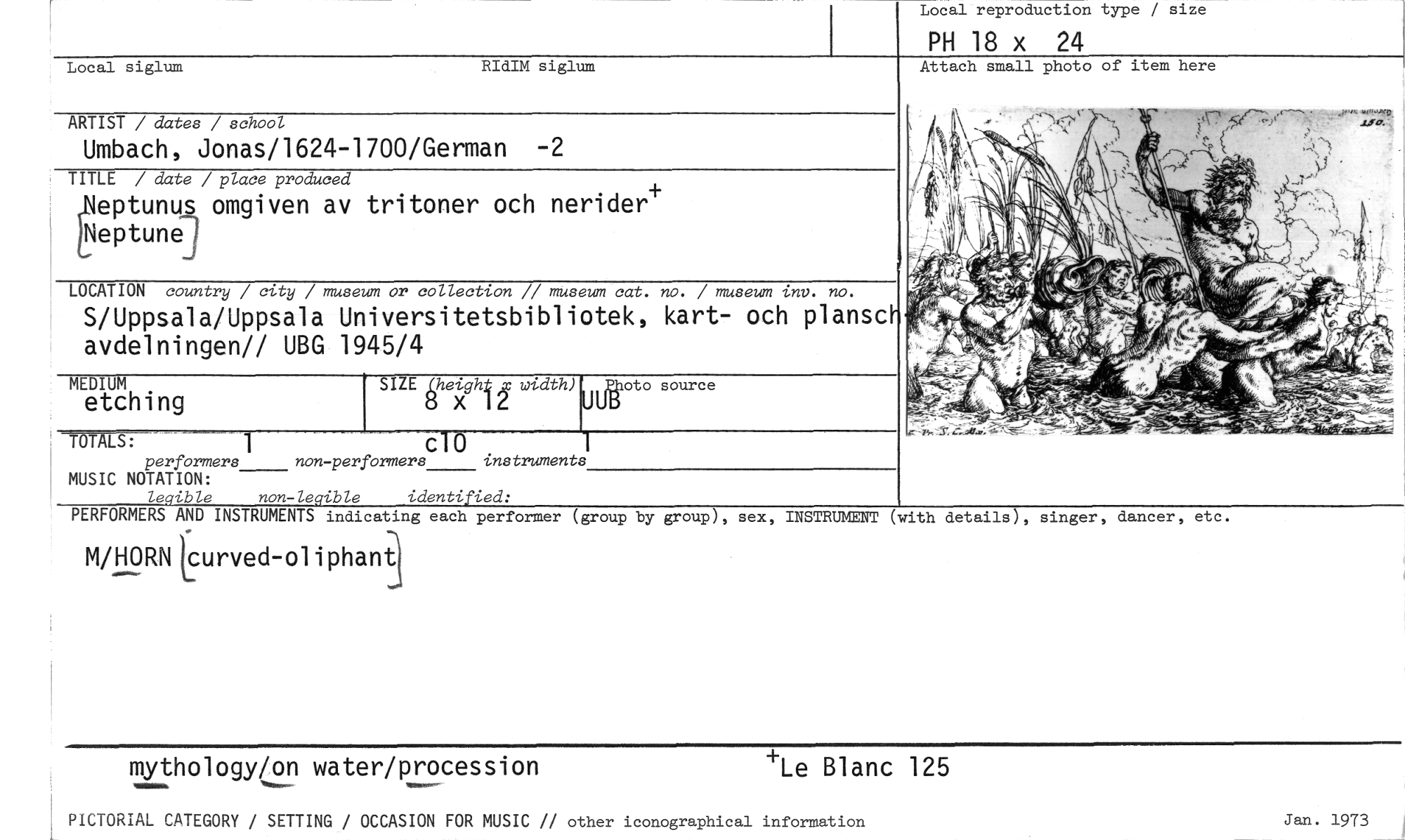//// Local reproduction type / size //// PH 18 x 24 //// Attach small photo of item here //// Local siglum RIdIM siglum //// ARTIST / dates / school //// Umbach, Jonas/1624-1700/German -2 //// TITLE / date / place produced //// geptunu omgiven av tritoner och nerider+ eptune //// LOCATION country / city / museum or collection // museum cat. no. / museum inv. no. //// S/Uppsala/Uppsala Universitetsbibliotek, kart- och plansch avdelningen// UBG 1945/4 //// SIZE Iheight _x width) goto source //// 8 x 12 //// TOTKOPf-- 1 //// performers_ //// MUSIC NOTATION: //// Ze•ible non-le•ible identi ied: //// PERFORMERS AND INSTRUMENTS indicating each performer (group by group), sex, INSTRUMENT (with details), singer, dancer //// M/HORN kurved-ol i phan.9 //// mythology/on water/procession +Le Blanc 125 //// MEDIUM etching //// cTO //// non-performers instruments //// etc //// PICTORIAL CATEGORY / SETTING / OCCASION FOR MUSIC // other iconographical information //// Jan. 1973 ////