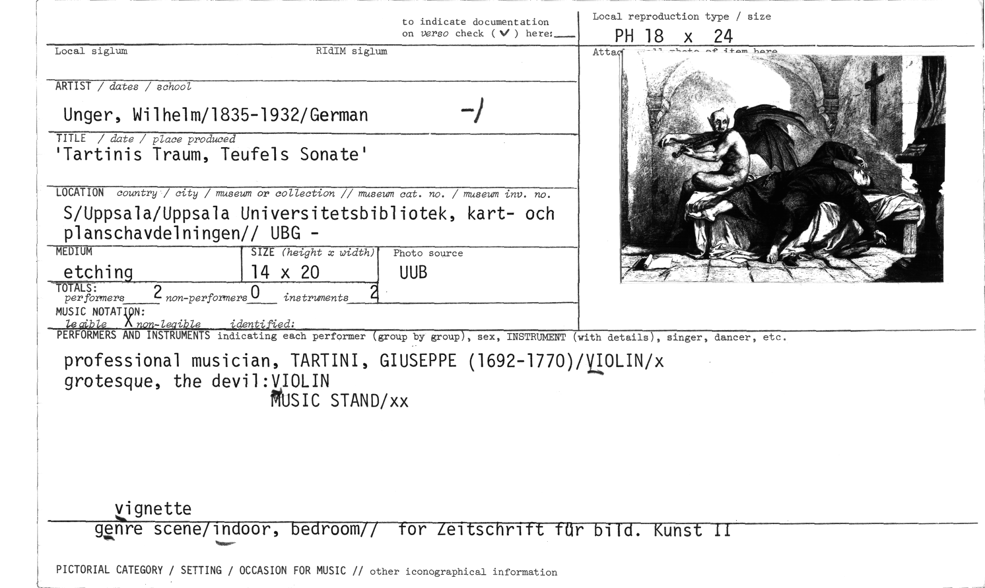 //// to indicate documentation //// on verso check (V ) here:- //// Local siglum RIdIM siglum //// ARTIST / dates / school //// Unger, Wilhelm/1835-1932/German //// TITLE / date / place produced //// 'Tartinis Traum, Teufels Sonate' //// 4•00.- //// k- I //// MEDIUM SIZE (height x width) //// ee //// 14 x 20 //// Photo source //// UUB //// T T LS: //// per formers 2 non-perfortners 0 instruments //// MUSIC NOTATIM: //// lecible Anon-leaible identified: //// PERFORMERS AND INSTRUMENTS indicating each performer (group by group), sex, //// INSTRUMENT (with details), singer, dancer, etc. //// professional musician, TARTINI, GIUSEPPE (1692-1770)/OLIN/x grotesque, the devil:VIOLIN //// "SIC STAND/xx //// yignette //// nnre scene/indoor, bedroom// tor Leitschritt tUr biTd. Kunst fl //// PICTORIAL CATEGORY / SETTING / OCCASION FOR MUSIC // other iconographical information //// Local reproduction type / size //// PH 18 x 24 //// Atta //// LOCATION country / city / museum or collection // museum cat. no. / museum tnv. no. //// S/Uppsala/Uppsala Universitetsbibliotek, kart- och planschavdelningen// UBG - ////