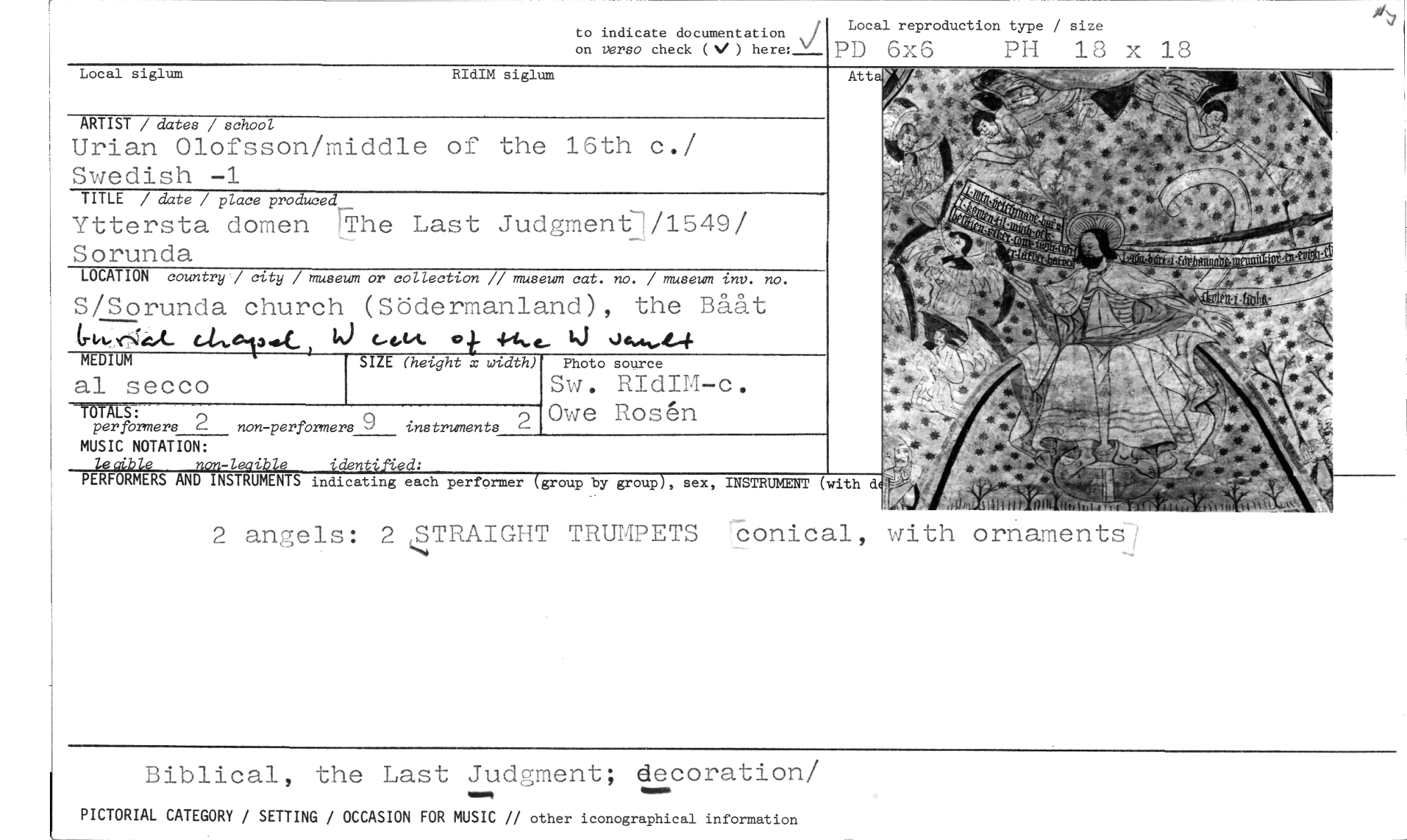 //// 2 angels: 242TRAIGHT TRUMPETS conical, with ornaments //// Biblical, the Last Judgment; decoration/ //// PICTORIAL CATEGORY / SETTING / OCCASION FOR MUSIC // other iconographical information //// to indicate documentation //// on verso check ( I ) here: \i //// Local siglum RIdIM siglum //// ARTIST / dates / school //// Urian Olofsson/middle of the 16th c./ Swedish -1 //// Local reproduction type / size //// P3 (5x6 PH 13 x 13 //// TITLE / date / place produced__ //// Yttersta domen The Last Judgmentl/1549/ Sorunda //// LOCATION country / city / museum or collection // museum cat. no. / museum inv. no. //// S/Sorunda church (Södermanland), the Bååt //// c-but 4-- e- kl •It4%-1-4 //// --MEDIUM SIZE (height x width) Photo //// al secco //// TOTALS: //// per formers 2 non-perfOrmers 9 instruments //// MUSIC NOTATION: //// -1 i e •dent. • : //// PERFORMERS AND INSTRUMENTS indicating each performer group by group , sex, INSTRUMENT (with dc //// c //// source //// Sw. RIdIM-c. Owe Rosen //// * 't_te.tft-27 Ad4,- ////
