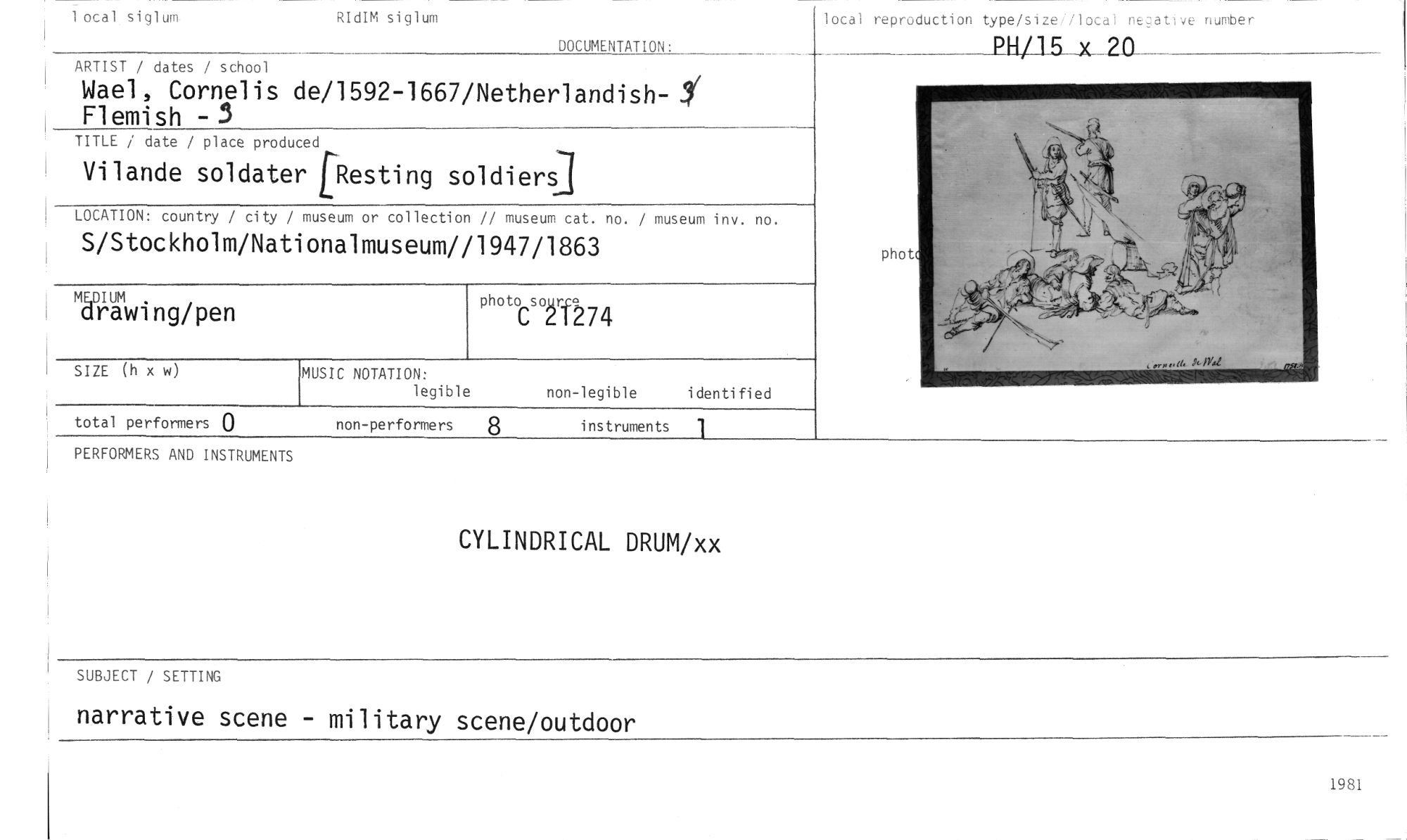 //// local reproduction type/sizei/local negatIve number //// PH/15 x 20 //// 1 ocal siglum RIdIM siglum //// DOCUMENTATION: //// ARTIST / dates / school //// Wael, Cornelis de/1592-1667/Netherlandish- 1( //// Flemish -5 //// TITLE / date / place produced //// Vilande soldater fResting soldiers] //// //// LOCATION: country / city / museum or collection // museum cat. no. / museum inv. no. //// S/Stockholm/Nationalmuseum//1947/1863 //// //// WäWing/pen photocsoärf.74 //// //// SIZE (h x w) MUSIC NOTATION: non-legible identified //// legible //// //// //// phot //// total performers 0 non-performers instruments //// PERFORMERS AND INSTRUMENTS //// CYLINDRICAL DRUM/xx //// SUBJECT / SETTING //// narrative scene - military scene/outdoor //// 1981 ////