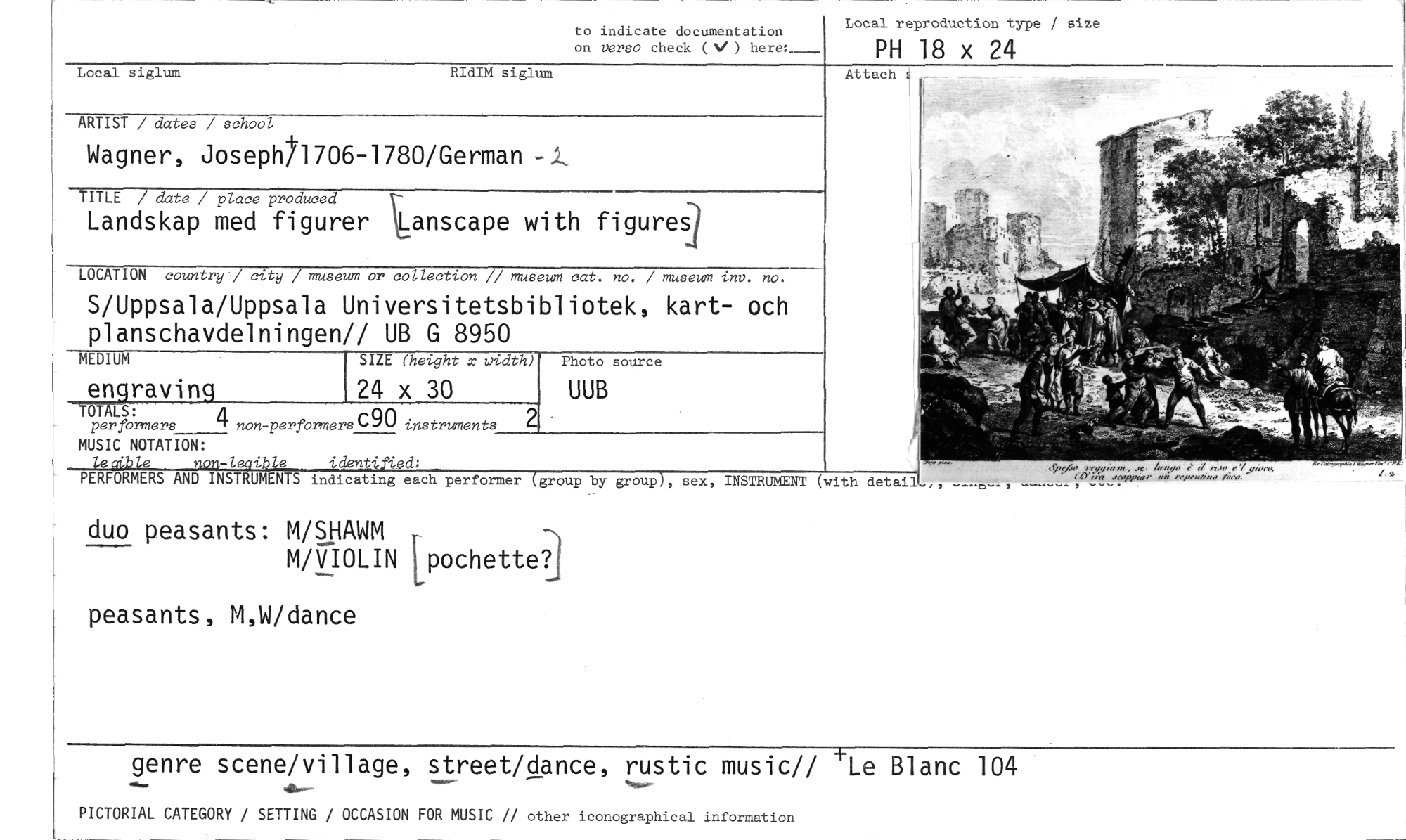 //// to indicate documentation //// on verso check (V) here:-- //// Local reproduction type / size //// PH 18 x 24 //// Local siglum RIdIM siglum //// ARTIST / dates / school //// Wagner, Joseph/+1706-1780/German //// TITLE / date / place produced //// Landskap med figurer Lanscape with figurel/ //// LOCATION country./ city / museum or collection 1/ museum cat. no. / museum inv. no. //// S/Uppsala/Uppsala Universitetsbibliotek, kart- och planschavdelningen// UB G 8950 //// MEDIUM SIZE (height x vidth) Photo source //// engraving 24 x 30 UUB //// -IttAls: //// per formers 4 non-performers C90 instruments //// MUSIC NOTATION: //// /-.i. e den ed: //// PERFORMERS AND INSTRUMENTS indicating each performer (group by group), sex, INSTRUMENT (with detail „ //// duo peasants: M/SHAWM //// M/VIOLIN lyochetta //// peasants, M,W/dance //// Attach //// •^ • //// genre scene/village, street/dance, rustic music// +Le Blanc 104 //// PICTORIAL CATEGORY / SETTING / OCCASION FOR MUSIC // other iconographical information ////