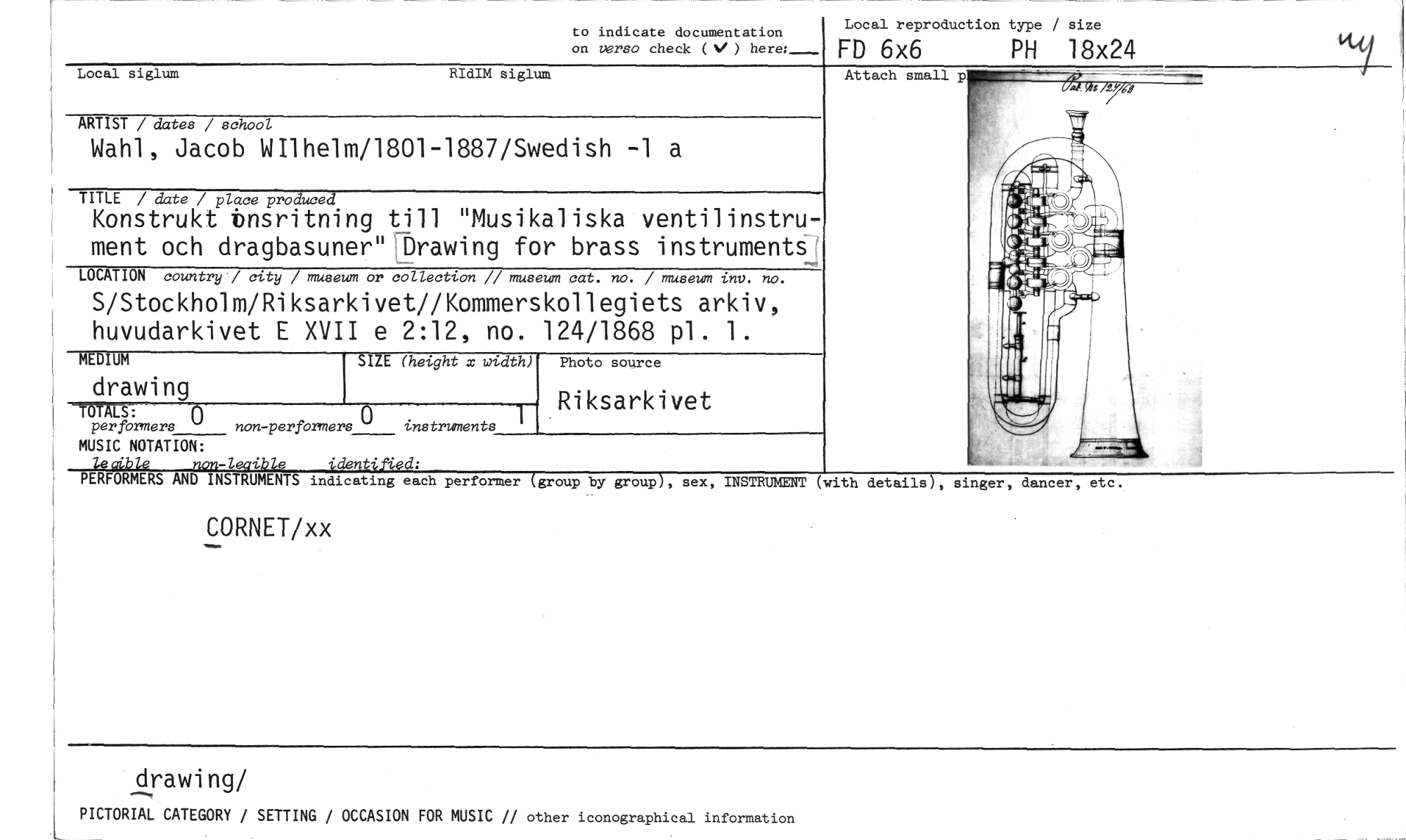 //// to indicate documentation Local reproduction type / size //// on versa check (V ) here: FD 6x6 //// PH 18x24 //// Local siglum R dIM siglum //// ARTIST / dates / school //// Wahl, Jacob WIlhelm/1801-1887/Swedish -1 a //// TITLE / date / place produced //// Konstrukt ensritning till "Musikaliska ventilinstrument och dragbasuner";brawing for brass instruments' //// LOCATION country / city / museum or collection // museum cat. no. / museum tnv. no. //// S/Stockholm/Riksarkivet//Kommerskollegiets arkiv, huvudarkivet E XVII e 2:12, no. 124/1868 pl. 1. //// MEDIUM SIZE (height x width) Photo source //// drawing //// LS: //// per formers o non-perforners instruments //// MUSIC NOTATION: //// _kpaible non-leaible identified: //// PERFORMERS AND INSTRUMENTS indicating each performer (group by //// CORNET/xx //// drawing/ //// PICTORIAL CATEGORY / SETTING / OCCASION FOR MUSIC // other iconographical information //// Riksarkivet //// Attach small //// P //// group), sex, INSTRUMENT (with details), singer, dancer, //// etc. ////