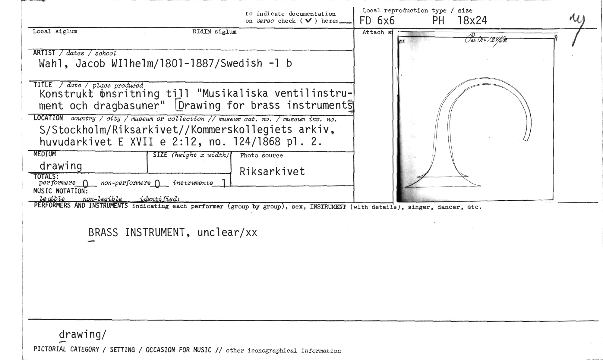 //// to indicate documentation //// Local reproduction type / size //// on versa check (V) here:_--- FD 6x6 PH 18x24 //// Local siglum RIdIM siglum //// ARTIST / dates / school //// Wahl, Jacob WIlhelm/1801-1887/Swedish -1 b //// Attach si //// TITLE / date / place produced //// Konstrukt ensritning till "Musikaliska ventilinstru- //// ment och dragbasuner" flDrawing for brass instruments //// LOCATION country / city / museum or collection // museum cat. no. / museum tnv. no. //// S/Stockholm/Riksarkivet//Kommerskollegiets arkiv, huvudarkivet E XVII e 2:12, no. 124/1868 pl. 2. //// MEDIUM //// drawing //// rDTALS: //// per formers o non -perfbrmers_a_ instruments //// MUSIC NOTATION: //// non-leaible identified; //// PERFORMERS AND INSTRUMENTS indicating each performer (group by group), sex, INSTRUMENT //// BRASS INSTRUMENT, unclear/xx //// drawing/ //// PICTORIAL CATEGORY / SETTING / OCCASION FOR MUSIC // other iconographical information //// SIZE (height x uidth) //// Photo source //// Riksarkivet //// (with details), singer, dancer, etc. ////