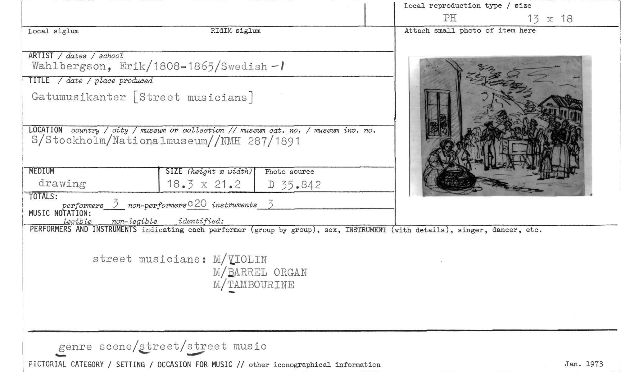 //// Local reproduction type / size //// PH 13 x 18 //// Attach small photo of item here //// Local siglum RIdIM siglum //// ARTIST / dates / school //// Wahlbergson, Erik/1808-1865/Swedish —1 //// TITLE / date / place produced //// Gatumusikanter [Street musicians] //// LOCATION country / city / museum or collection // museum cat. no. / museum inv. no. //// S/Stockholm/Nationalmuseum/iNKH 287/1891 //// MEDIUM //// drawing //// TO-AM //// perförmers 3 non -performerse20 instruments 3 //// MUSIC NOTATION: //// legible non -legible identified: //// PERFORMERS AND INSTRUMENTS indicating each performer (group by group), sex, //// street musicians: M/1IOLIN //// M/ZARREL ORGAN M/TAMBOURINE //// SIZE (height x width) //// 18.3 x 21.2 //// Photo source //// D 35.842 //// INSTRUMENT (with details), singer, dancer, etc. //// genre scene/treet/street music //// PICTORIAL CATEGORY / SETTING / OCCASION FOR MUSIC // other iconographical information //// Jan. 1973 ////