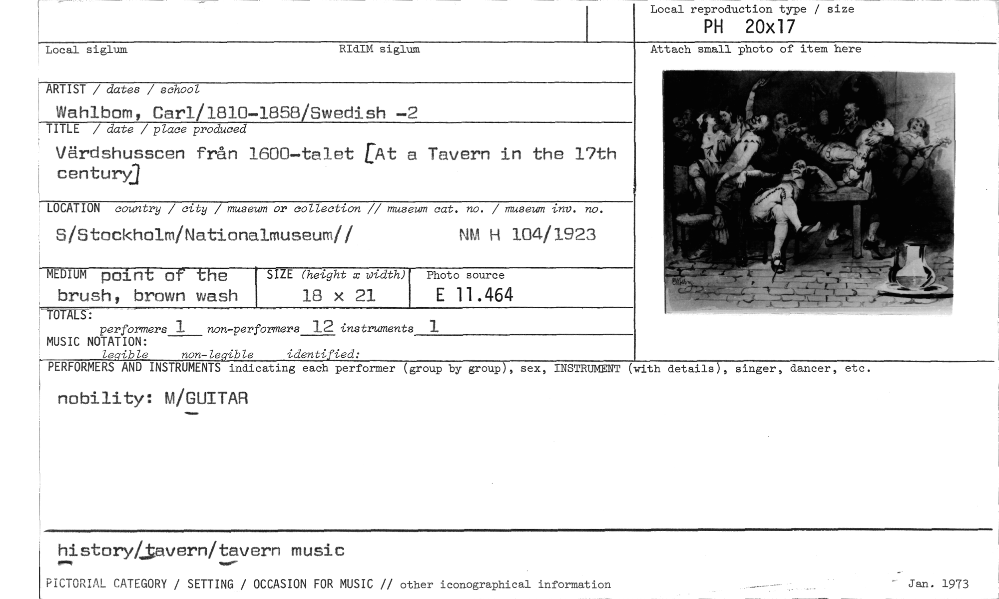 //// nistoryaavern/tavern music //// PICTORIAL CATEGORY / SETTING / OCCASION FOR MUSIC // other iconographical information - Jan. 1973 //// S/Stockholm/Nationalmuseum// //// NM H 104/1923 //// Local reproduction type / size //// PH 20x17 //// Local siglum RIdIM siglum //// ARTIST / dates / school //// Wahlbom, Carl/1810-1858/Swedish —2 //// TITLE / date / place produced //// Värdshusscen från 1600—talet [At a Tavern in the 17th centuryj //// LOCATION country / city / museum or collection // museum cat. no. / museum inv. no. //// SIZE (height x width) //// 18 x 21 //// 'TÖTALS: //// per formers 1 non-performers 12 instruments 1 MUSIC NOTATION: //// leqible non-leqible identified: //// PERFORMERS AND INSTRUMENTS indicating each performer (group by //// nobility: M/GUITAR //// Attach small photo of item here //// MEDIUM point of the brush, brown wash //// Photo source //// E 11.464 //// details), singer, dancer, etc. //// group), sex, INSTRUMENT (with ////