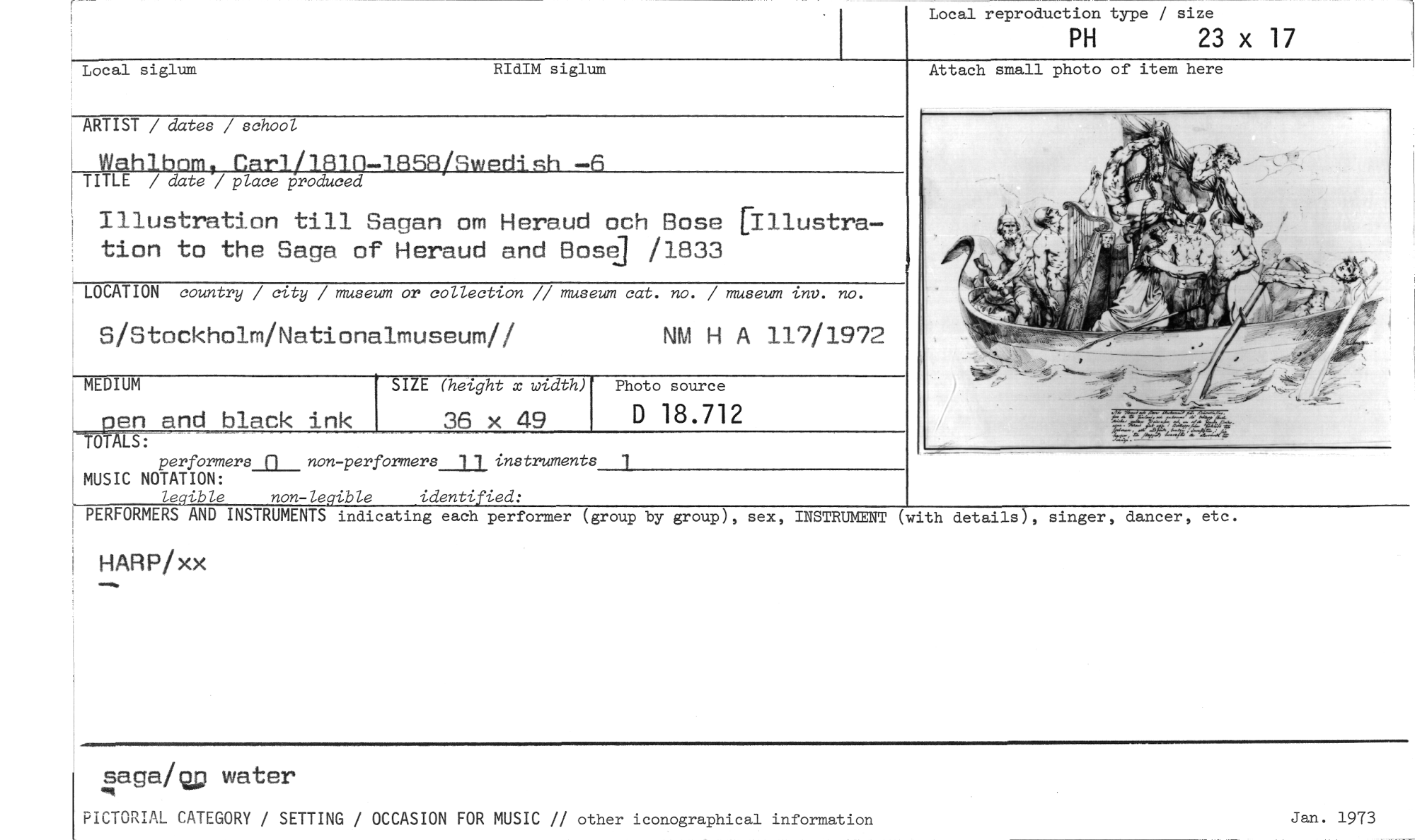 //// Local reproduction type / size //// PH 23 x 17 //// //// Local siglum RIdIM siglum Attach small photo of item here //// ARTIST / dates / school //// Wahlbnm, Car1/18111-1J8/Swpdish —6 //// TITLE / date / place produced //// Illustration till Sagan om Heraud och Bose [Illustration to the Saga of Heraud and Base] /1833 //// LOCATION country / city / museum or collection // museum cat. no. / museum inv. no. //// S/Stockholm/Nationalmuseum// NM H A 117/1972 //// MEDIUM //// -41ALS: //// en and black ink //// performers_11__non-performers_22 instruments 1 MUSIC NOTATION: //// ledible non-legible identified: //// PERFORMERS AND INSTRUMENTS indicating each performer (group by group), sex, //// SIZE (height x width) Photo source //// 36 x49 D 18.712 //// INSTRUMENT (with details), singer, dancer, etc. //// HARP/xx //// sagalusp water //// PICTORIAL CATEGORY / SETTING / OCCASION FOR MUSIC // other iconographical information //// Jan. 1973 ////