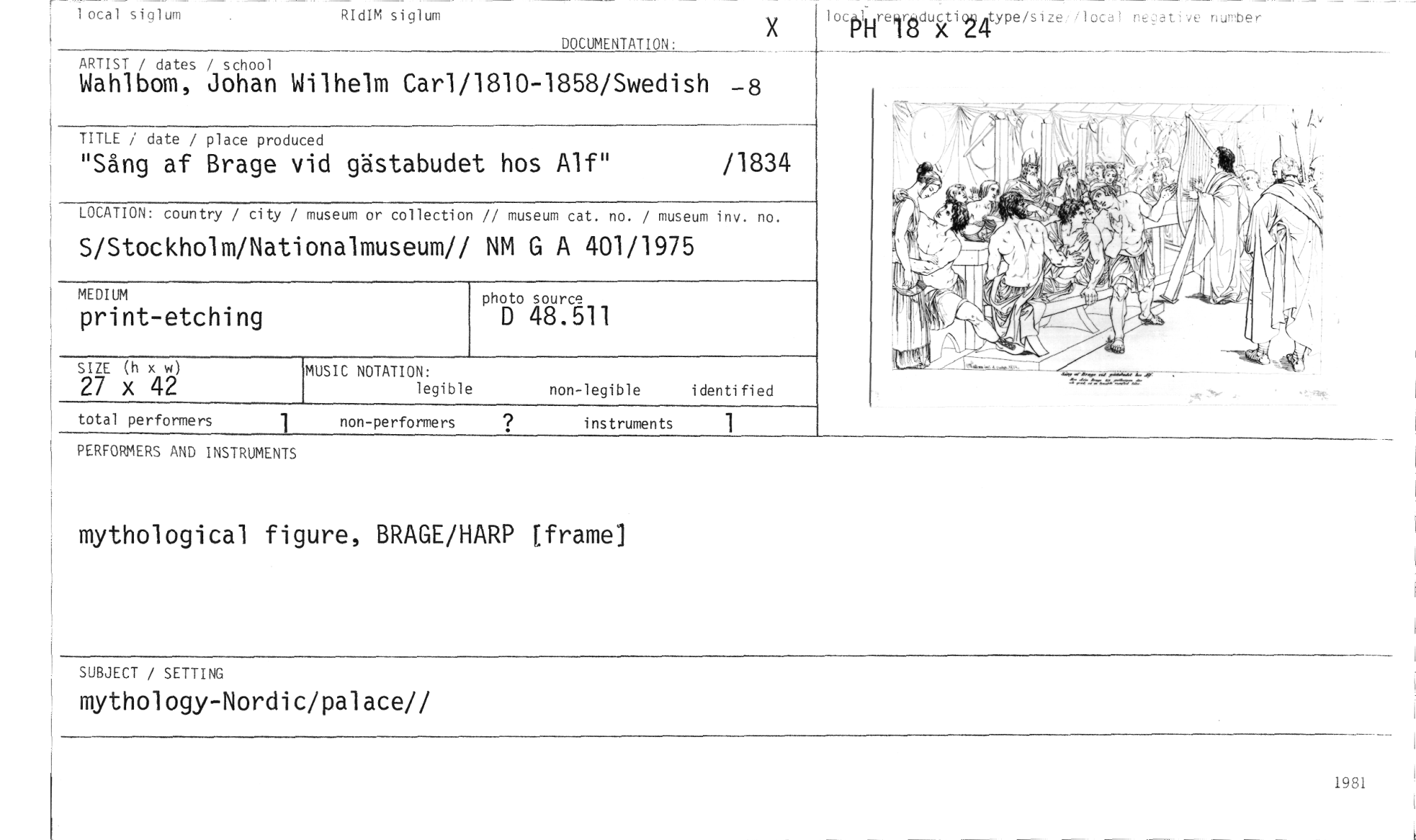 //// number //// lotal siglum RIdIM siglum //// DOCUMENTATION: //// 1 octoltireirkductiog Atype/s i ze /lotal 0i X 41-1- //// x //// //// ARTIST / dates / school //// Wahlbom, Johan Wilhelm Car1/1810-1858/Swedish -8 //// TITLE / date / place produced //// "Sång af Brage vid gästabudet hos Alf" /1834 //// LOCATION: country / city / museum or collection // museum cat. no. / museum inv. no. //// S/Stockholm/Nati onalmuseum// NM G A 401/1975 //// //// MEDIUM photo source //// print-etching D 48.511 //// //// SIZE (h x w) MUSIC NOTATION: //// 27 x 42 legible non-legible identified //// //// //// total performers 1 non-performers instruments 1 //// PERFORMERS AND INSTRUMENTS //// mythological figure, BRAGE/HARP [frame] //// SUBJECT / SETTING //// mythology-Nordic/palace// //// 1981 ////
