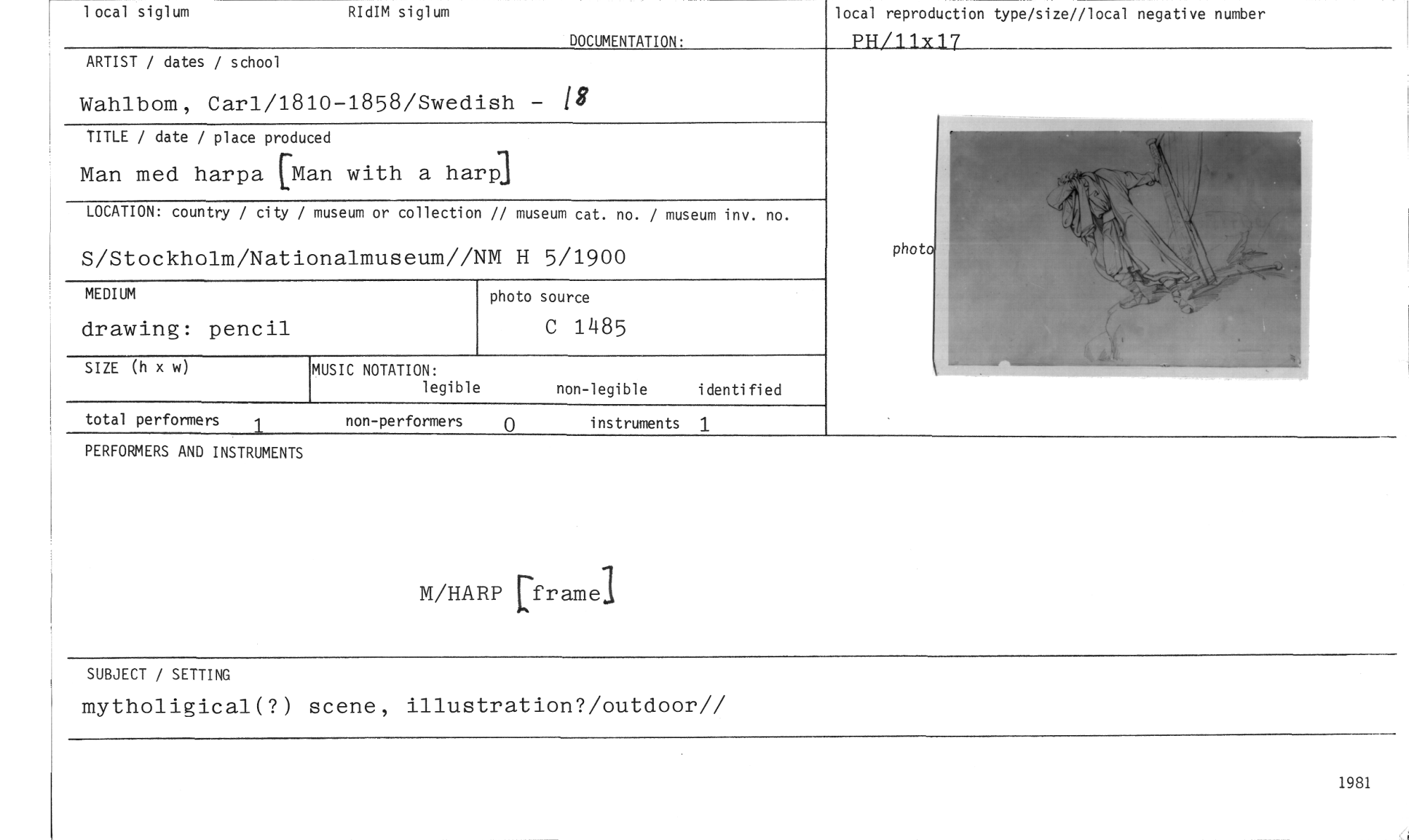 //// 1981 //// MUSIC NOTATION: //// legible //// non-legible identified //// phot //// total perforrners 1 //// non-performers 0 instruments 1 //// local siglum RIdIM siglum //// ARTIST / dates / school //// local reproduction type/size//local negative number //// PH/11x17 //// Wahlbom, Carl/1810-1858/Swedish - IS //// TITLE / date / place produced //// Man med harpa [Man with a karp, //// LOCATION: country / city / museum or collection // museum cat. no. / museum inv. no. //// S/Stockholm/Nationalmuseum//NM H 5/1900 //// photo source //// C 1485 //// SIZE (h x w) //// PERFORMERS AND INSTRUMENTS //// M/HARP framel //// SUBJECT / SETTING //// mytholigical(?) scene, illustration?/outdoor// //// DOCUMENTATION. //// MEDIUM //// drawing: pencil ////