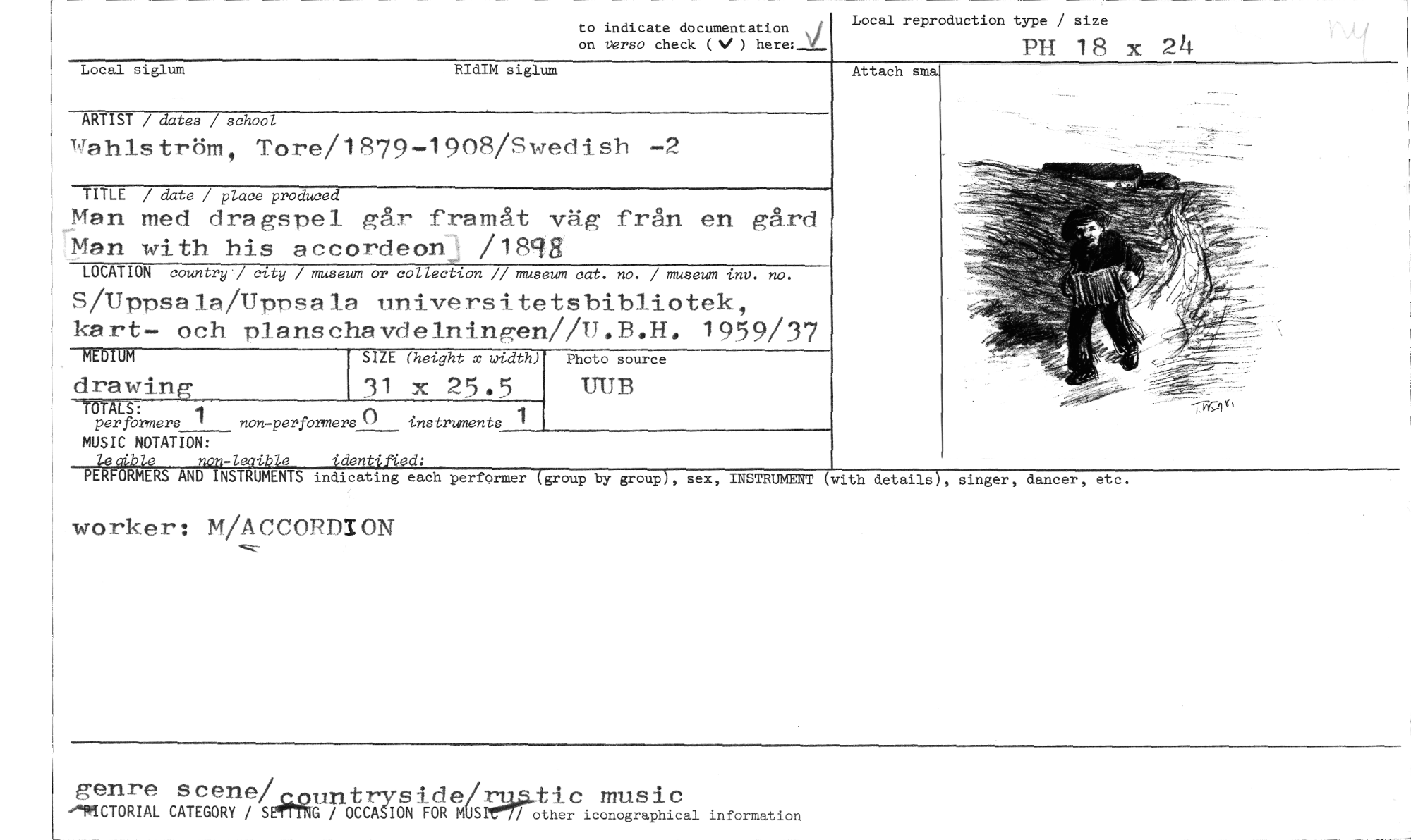 //// to indicate documentation on verso check ('..1 ) here; //// Local reproduction type / size //// PH 18 x 2 //// Local siglum RIdIM siglum //// ARTIST / datea / school //// Wahlström, Tore/1879-1908/Swedish -2 //// TITLE / date / place produced //// Man med dragspel går framåt väg från en gård :Man with his accordeon3 /1844 //// LOCATION country / city / museum or collection // museum cat. no. / museum inv. no. //// S/Uppsala/Uppsala universitetsbibliotek, kart- och planschavdelningen//U.B.H. 1959/37 //// MEDIUM SIZE (height x width) Photo source //// 31 x 25.5 //// drawing //// TOTALS: //// per formers 1 non-perfbrmers 0 instruments 1 //// UUB //// Attach sma //// MUSIC NOTATION: //// leaible non-leaible identified: //// PERFORMERS AND INSTRUMENTS indicating each //// worker: M/ACCORDION //// performer (group by group), sex, INSTRUMENT (with details), singer, dancer, etc. //// genre sceneLenuntrysidemdruks.tic music //// -"MICTORIAL CATEGORY / SETTTNG / OCCASION FOR SPL"7/ other iconographical information ////