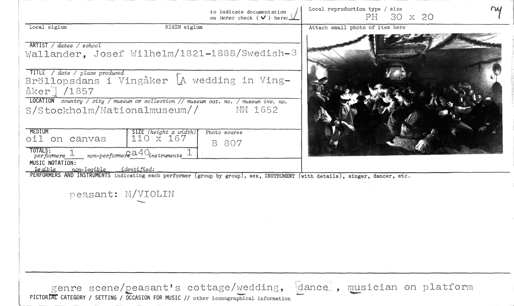 //// Local reproduction type / size //// PH 30 x 20 //// RAI //// Attach small photo of item here //// on uerso check ( ) here: //// to indicate documentation //// ocal siglum RIdIM siglum //// ARTIST / dates / school //// Wallander, Josef Wilhelm/1821-1888/Swedish-3 //// TITLE / date / place produced //// Bröllopsdans i Vingåker LA wedding in Ving - åkeri, /1857 //// LOCATION country / city / museum or collection // museum cat. no. / museum tnv. no. //// S/Stockholm/Nationalmuseum// NM 1652 //// SIZE (hetght x width) //// 110 x 167 //// -1=7---.1 //// perfbrmers non-performe9E140,., nstruments //// MUSIC NOTATION: //// lecibte non-leaible identiAed: //// PERFORMERS AND INSTRUMENTS indicating each performer (-group by group), sex, INSTRUMENT //// peasant: M/VIOLIN //// genre scene/wasant's cottage/wedding, musician on platform //// Nmem^ //// PICTORTt CATEGORY / SETTING / OCCASION FOR MUSIC // other iconographical information //// MEDIUM //// oil on canvas //// Photo source //// B 807 //// (with detailsj, singer, dancer, etc. ////