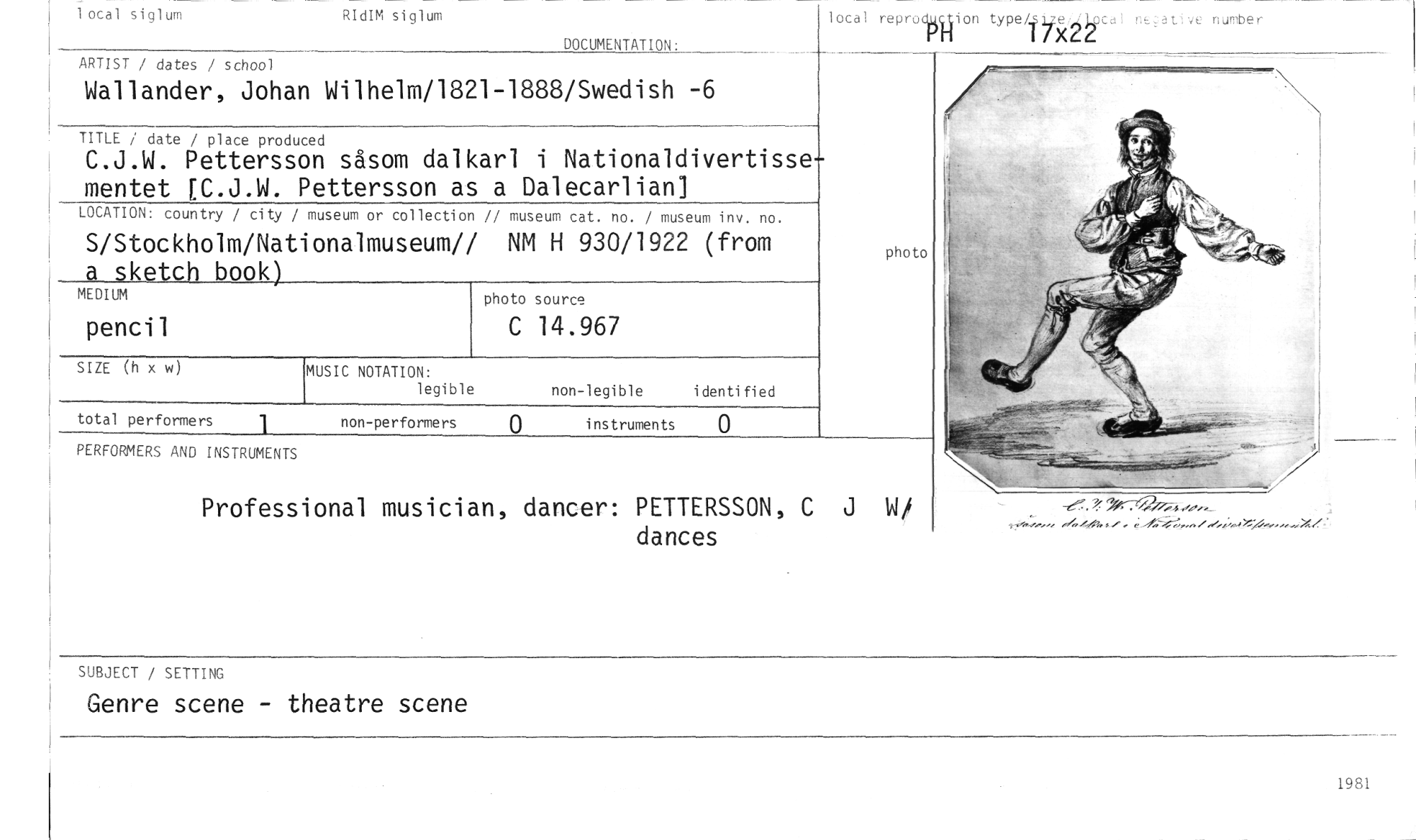 //// local siglum //// RIdIM siglum //// DOCUMENTATION: //// local reprocNion type44/X e,A1,4ocal neatIve nurober //// I L //// ARTIST / dates / school //// Wallander, Johan Wilhelm/1821-1888/Swedish -6 //// TITLE / date / place produced //// C.J.W. Pettersson såsom dalkarl i Nationaldivertissementet [C.J.W. Pettersson as a Dalecarlian] //// LOCATION: country / city / museum or collection // museum cat. no. / museum inv. no. //// S/Stockholm/Nationalmuseum// NM H 930/1922 (from a sketch book) //// photo //// MEDIUM //// photo source //// C 14.967 //// pencil //// SIZE (h x w) //// MUSIC NOTATION: //// legible //// non-legible identified //// total performers 1 //// non-performers Q instruments //// 0 //// PERFORMERS AND INSTRUMENTS //// Professional musician, dancer: PETTERSSON, C J W/ //// dances //// SUBJECT / SETTING //// Genre scene - theatre scene //// 1981 ////