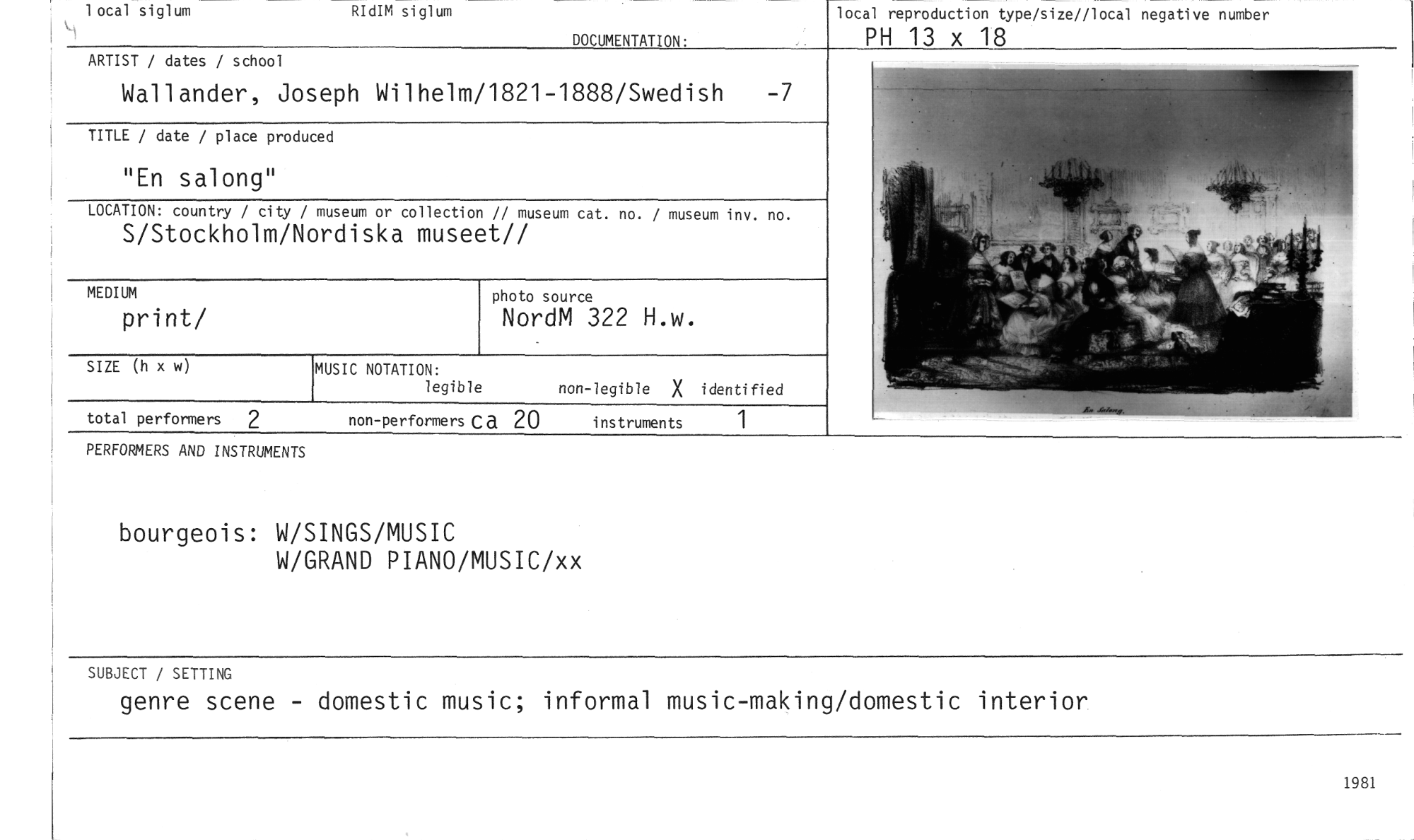 //// bourgeois: W/SINGS/MUSIC //// W/GRAND PIANO/MUSIC/xx //// SUBJECT / SETTING //// genre scene - domestic music; informal music-making/domestic interior //// 1981 //// photo source //// NordM 322 H.w. //// MEDIUM //// print/ //// RIdIM siglum //// 1 ocal si glum //// DOCUMENTATION: //// local reproduction type/size//local negative number //// PH 13 x 18 //// total performers 2 //// non-performers Ca 20 instruments 1 //// ARTIST / dates / school //// Wallander, Joseph Wilhelm/1821-1888/Swedish -7 //// TITLE / date / place produced //// "En salong" //// LOCATION: country / city / museum or collection // museum cat. no. / museum inv. no. //// S/Stockholm/Nordiska museet// //// SIZE (h x w) //// MUSIC NOTATION: //// legible non-legible X i denti fied //// PERFORMERS AND INSTRUMENTS ////