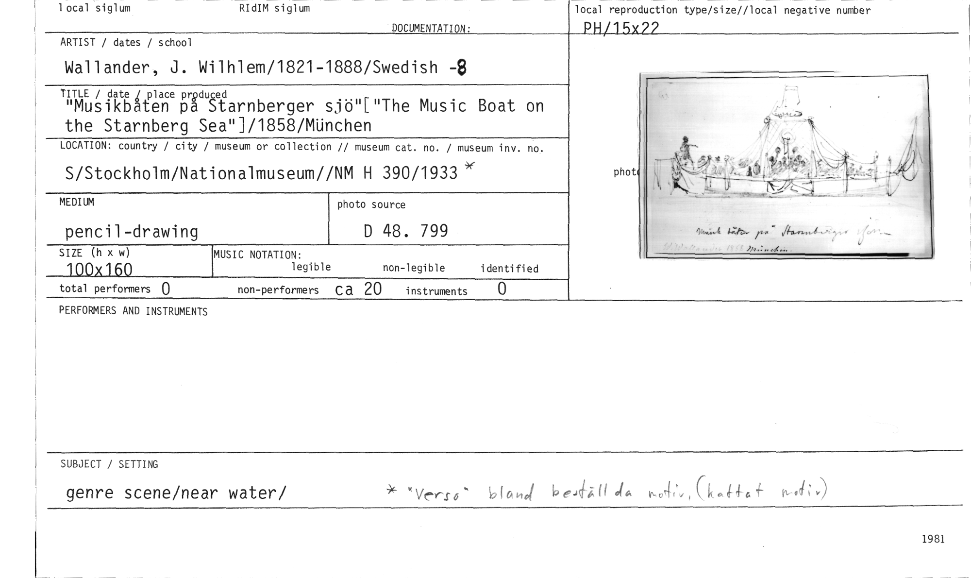 //// 1 ocal siglum RIdIM siglum //// local reproduction type/size//local negative number //// PH/15x22 //// DOCUMENTATION• //// ARTIST / dates / school //// Wallander, J. Wilhlem/1821-1888/Swedish -8 //// TITLE / date place pr9dued //// "Musikbaten pa Starnberger sjö"C"The Music Boat on the Starnberg Sea"]/1858/MUnchen //// LOCATION: country / city / museum or collection // museum cat. no. / museum inv. no. //// S/Stockholm/Nationalmuseum//NM H 390/1933.w //// photo source //// pencil-drawing //// MUSIC NOTATION: //// legible non-legible identified //// MEDIUM //// D 48. 799 //// SIZE (h x w) //// 100x160 //// phot //// total performers 0 non-performers Ca 20 instruments 0 //// PERFORMERS AND INSTRUMENTS //// SUBJECT / SETTING //// genre scene/near water/ "ver-so' 17(44 bemt;(I ÅÅ e-•Pp) //// 1981 ////