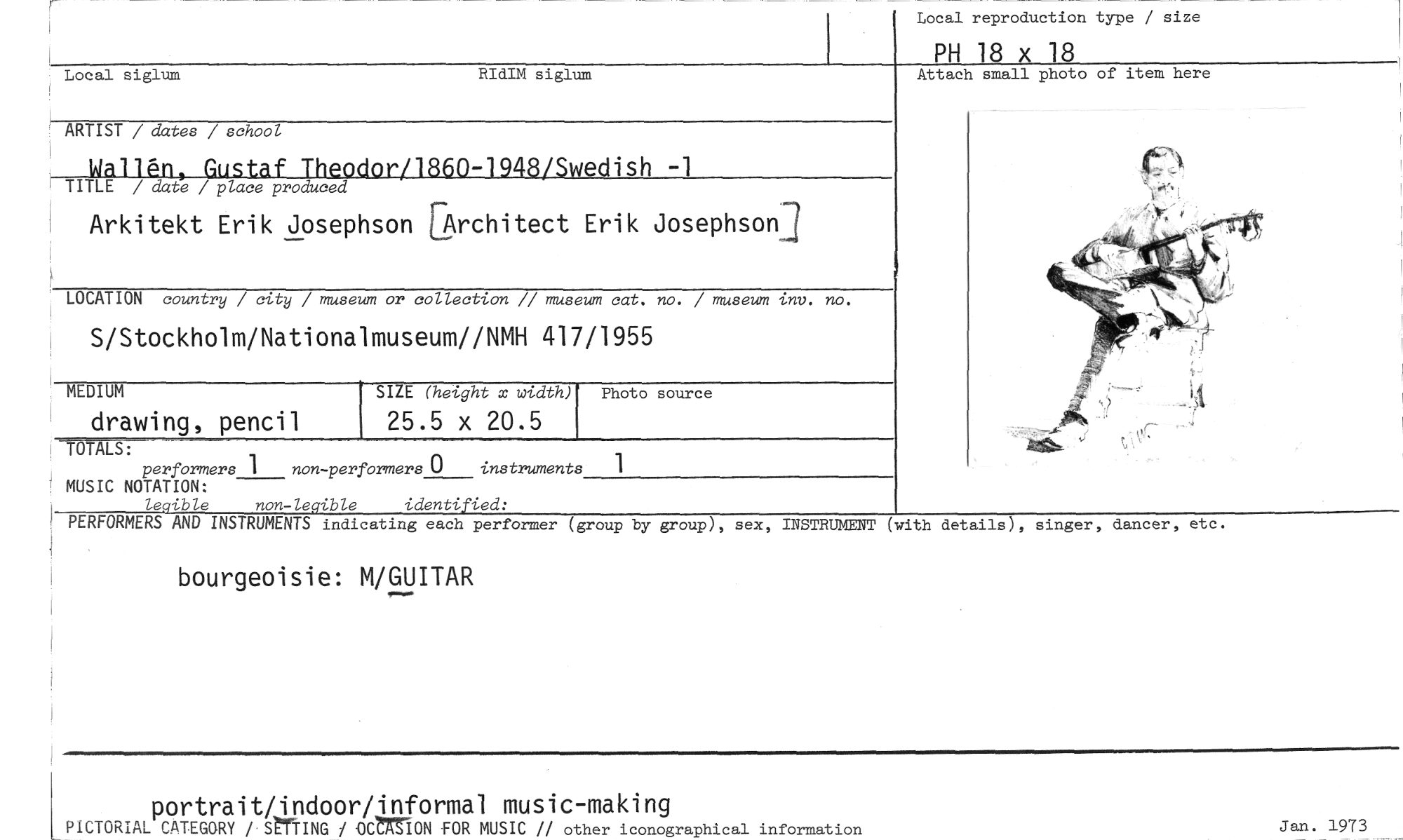 //// Local reproduction type / size //// PH 18 x 18 //// (-Y //// ARTIST / dates / school //// Gustaf Theodor/1860-1948/Swedish -1 //// TITLE / date / place produced //// Arkitekt Erik Josephson [Architect Erik Josephson //// LOCATION country / city / museum or collection // museum cat. no. / museum inv. no. //// S/Stockholm/Nationalmuseum//NMH 417/1955 //// MEDIUM SIZE (height x width) Photo source //// drawing, pencil 25.5 x 20.5 //// //// TOTALS: performers 1 non-performers 0 instruments 1 //// MUSIC NOTATION: //// legible non-legible identified: //// Attach small photo of item here //// Local siglum RIdIM siglum //// PERFORMERS AND INSTRUMENTS indicating each performer (group by group), sex, INSTRUMENT (with details), singer, dancer, etc. //// bourgeoisie: M/GUITAR //// portrait/indoor/informal music-making //// PICTORIAL CATEGORY / SPTtING / OCtrION FOR MUSIC // other iconographical information Jan. 1973 ////
