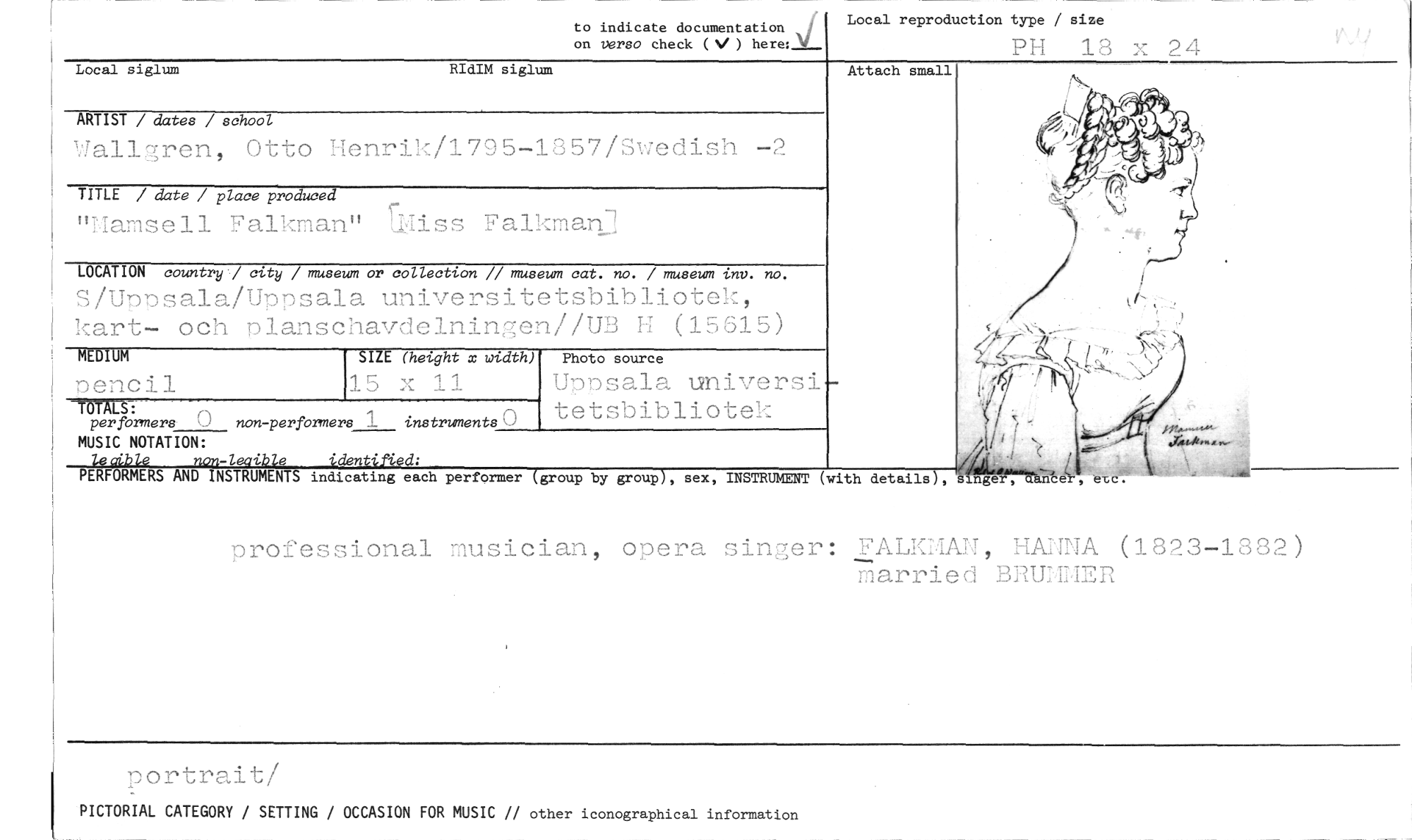 //// to indicate documentation _1(_ //// on verso check (V) here: //// Local reproduction type / size //// PH 13 x 24 //// Attach small //// 0/11411, i 'SI> 44: 1 //// ARTIST / dates / school //// Wallgren, Otto Henrik/1795-1857/Swedish -2 //// TITLE / date / place produced //// "Mamsell Falkman" 111.iss Falkmani //// LOCATION country/ city / museum or collection // museum cat. no. / museum Inv. no. //// S/Uppsala/Uppsala universitetsbibliotek, kart- och nlanschavdelningen//UB H (15615) //// Local siglum RIdIM siglum //// MEDIUM --SIZE (height x width) //// nencil 15 x 11 //// -TUM: //// perfbrmers () non-perfOlmers 1 instruments 0 Photo source //// Uppsala universi tetsbibliotek //// MUSIC NOTATION: //// Upaibls• -leaible identified: ä‘å'rål //// PERFORMERS AND NSTRUMENTS indicating each performer (group by group), sex, INSTRUMENT (with details), ge , er, e-ce. //// professional musician, opera singer: FALKMAN, HANNA (1823-1882) //// 7arried BRUMMER //// portrait/ //// PICTORIAL CATEGORY / SETTING / OCCASION FOR MUSIC // other iconographical information ////