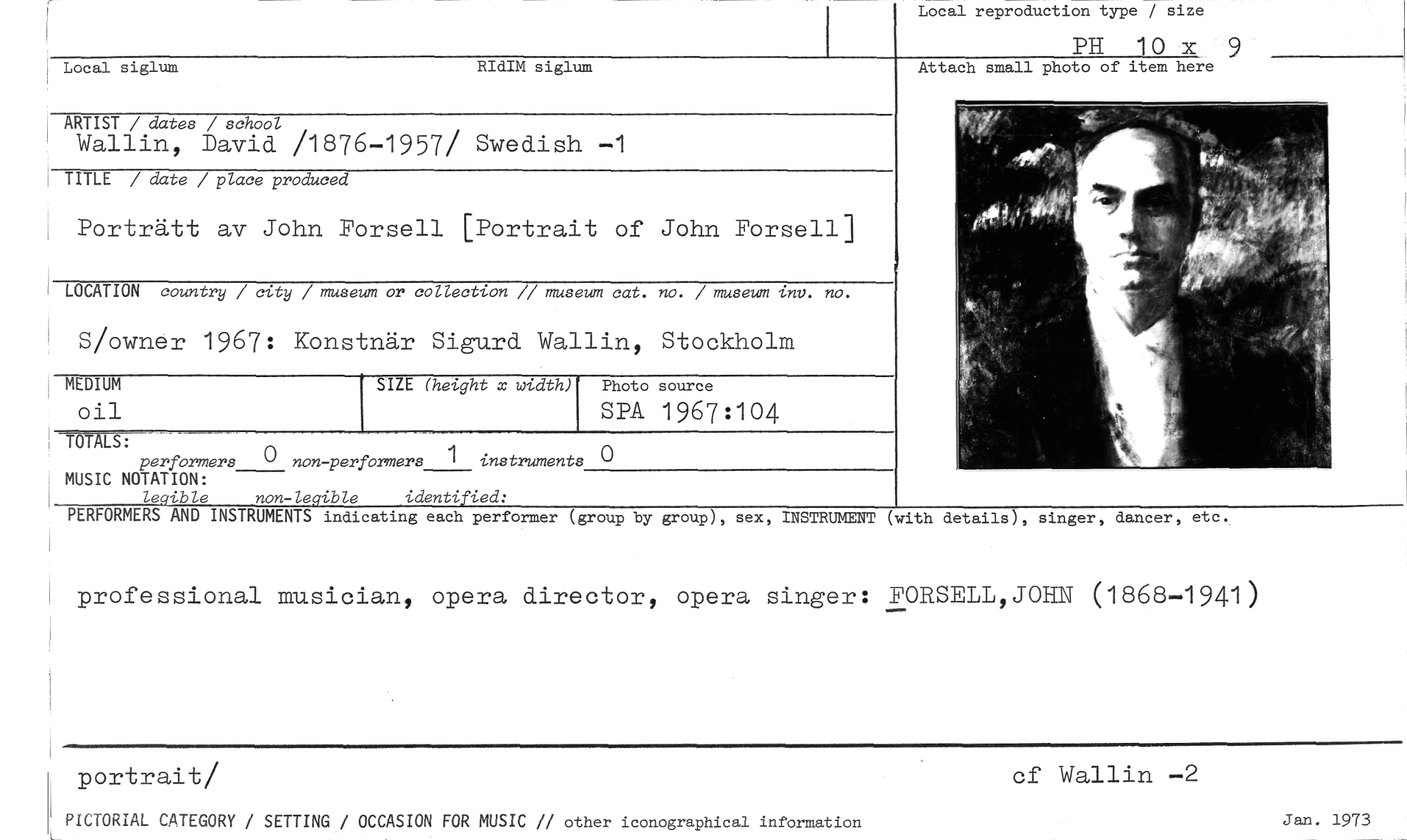 //// professional musician, opera director, opera singer: FORSELL,JOHN (1868-1941) //// Photo source //// SPA 1967:104 //// SIZE (height x width) //// ith details), singe //// , dancer, e //// Local siglum RIdIM siglum //// ARTIST / dates / school //// Wallin, David /1876-1957/ Swedish -1 //// TITLE / date / place produced //// Porträtt av John Forsell [Portrait of John Forsell] //// LOCATION country / city / museum or collection // museum cat. no. / museum tnv. no. //// S/owner 1967: Konstnär Sigurd Wallin, Stockholm //// MEDIUM //// oil //// -TNAM //// performers //// MUSIC NOTATION: //// le•ible non-le•ible identi ied: //// PERFORMERS AND INSTRUMENTS indicating each performer (group by group), sex, INSTRUMENT //// Local reproduction type / size //// PH 10 x - 9 //// Attach small photo of item here //// non-performers 1 instruments 0 //// portrait/ cf Wallin -2 //// L PICTORIAL CATEGORY / SETTING / OCCASION FOR MUSIC // other iconographical information Jan. 1973 ////